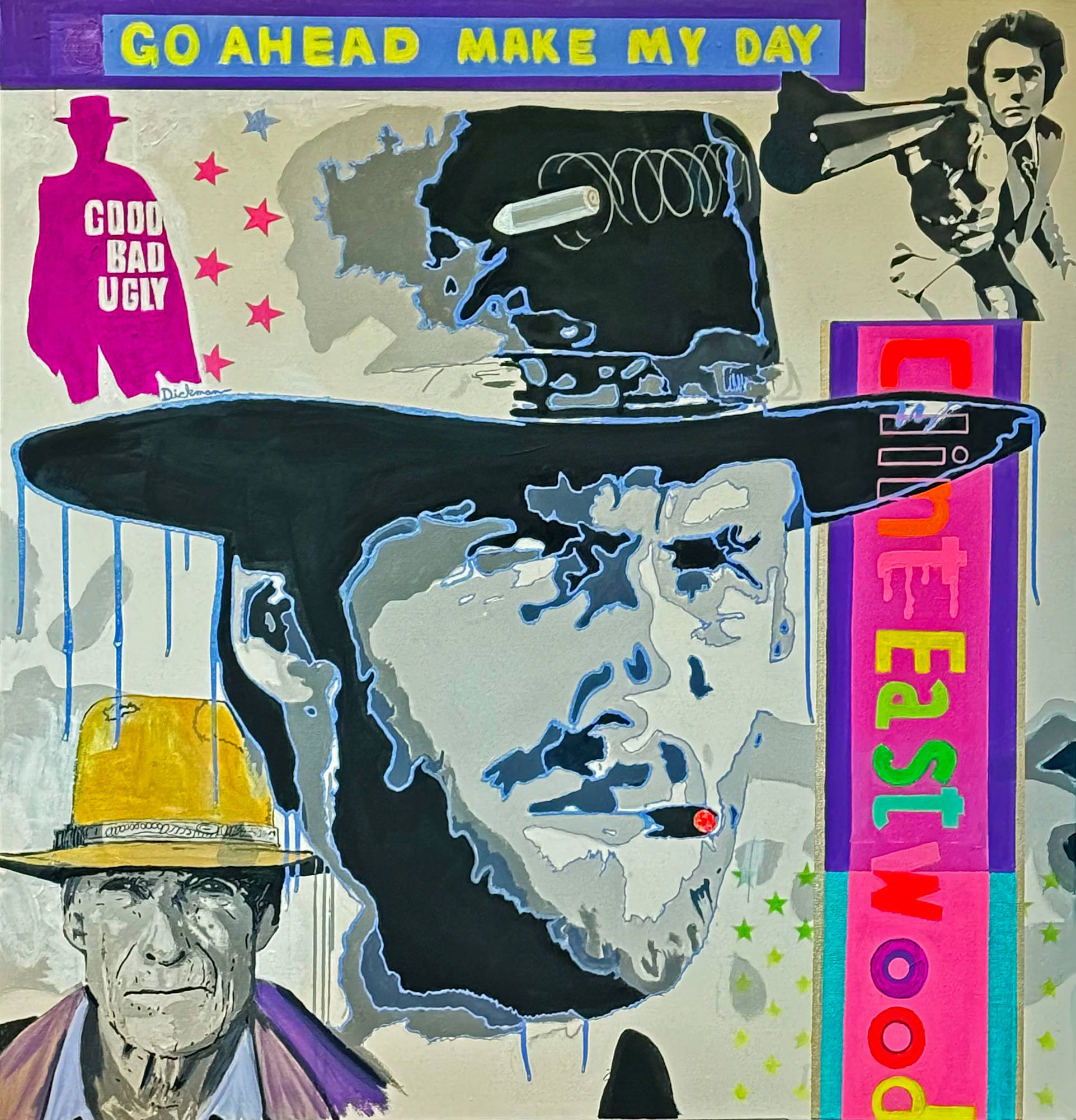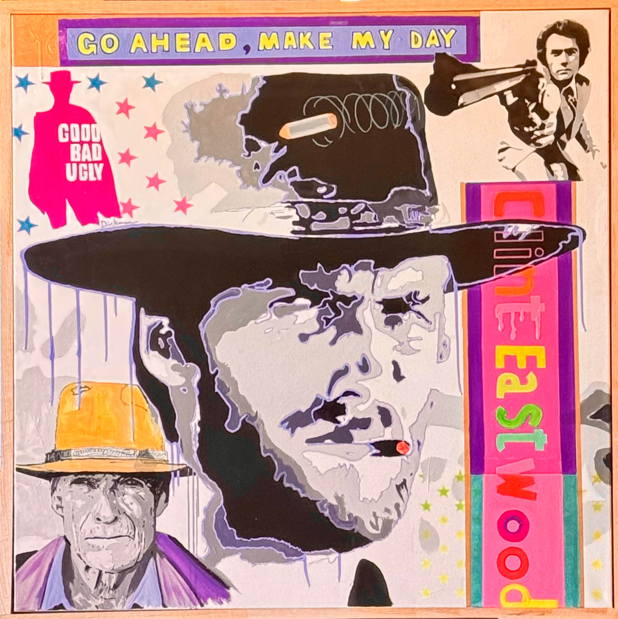 The artwork is a vibrant, mixed-media collage primarily centered around the theme of Clint Eastwood’s iconic movie characters. The central image is a stylized grayscale portrait of Eastwood wearing a wide-brimmed cowboy hat with a bullet in front of it and a cigarette held between his lips, evoking a tough and rugged demeanor. Above this portrait, a bold yellow text strip reads "GO AHEAD MAKE MY DAY." This phrase was popularized by Clint's character Harry Callahan in the movie Dirty Harry. To the upper left, a purple silhouette of Clint stands with the words "GOOD BAD UGLY," referencing the famous film "The Good, the Bad and the Ugly." Another smaller image of an older Clint Eastwood in a yellow cowboy hat is located in the lower left corner. On the right side of the artwork, there is another depiction of Clint Eastwood as Dirty Harry aiming a 357 Magnum. On the right, beneath Dirty Harry is vertical multicolored text "Clint Eastwood" running alongside. The overall composition blends graphic elements, text, and imagery to celebrate Clint Eastwood's influence in cinema.