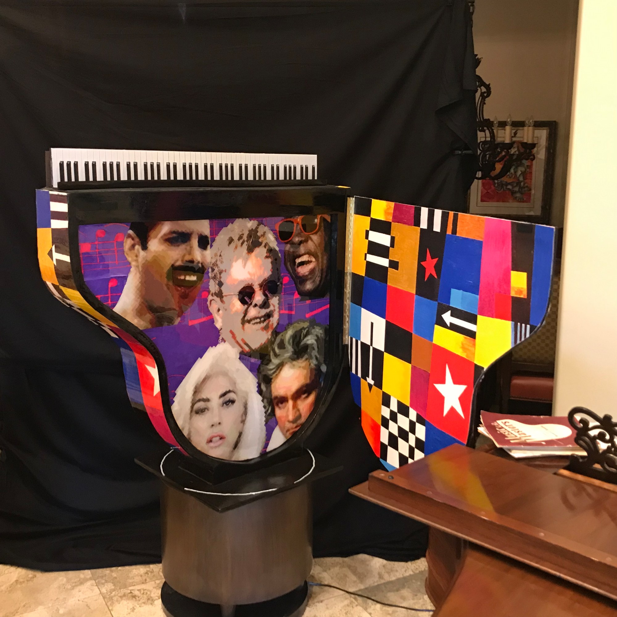 PAINTED PIANO SCULPTURE WITH PORTRAITS OF ELTON JOHN AND OTHER ROCK STARS