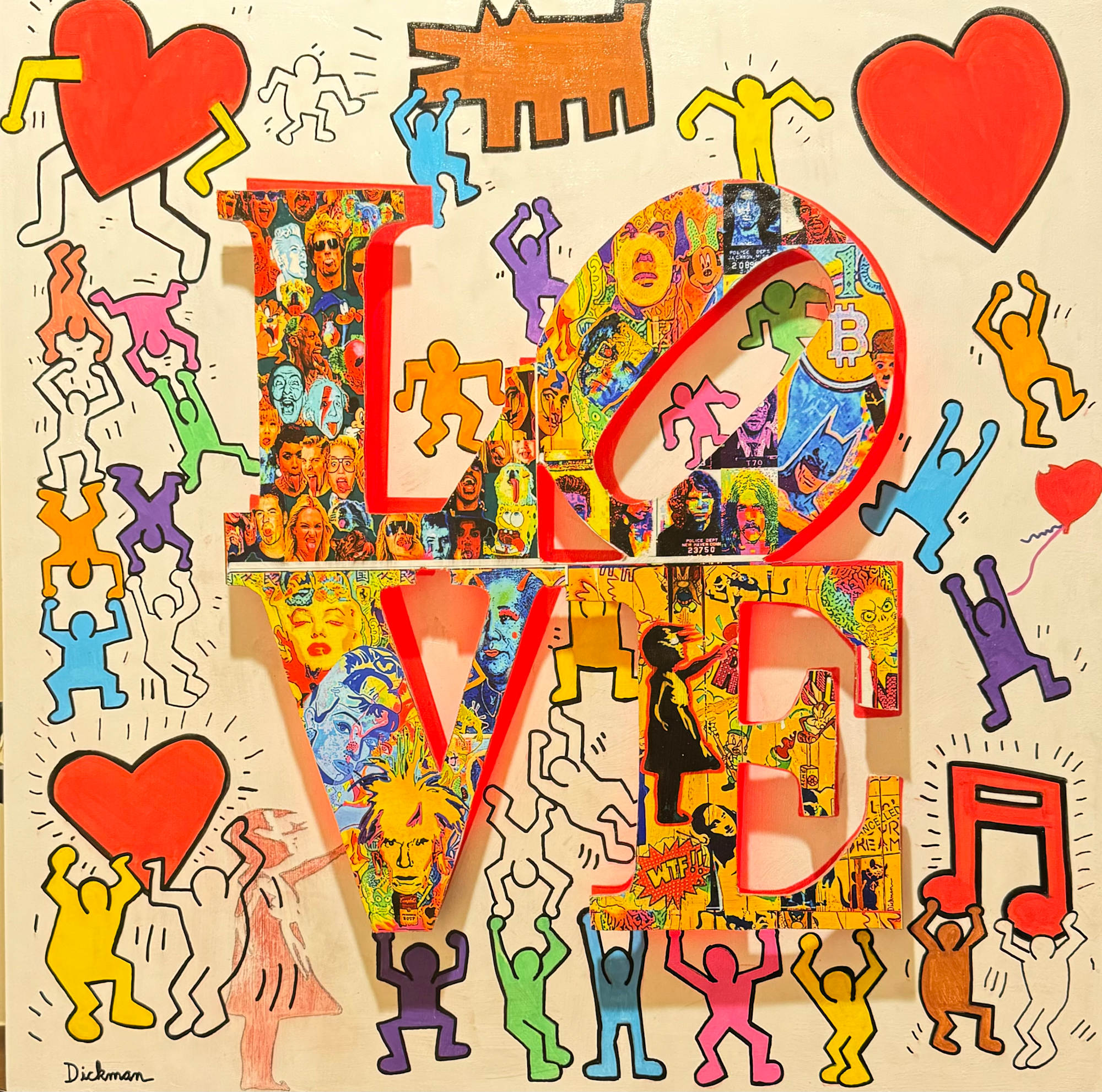 The artwork is a vibrant and colorful collage centered around the word "LOVE" in bold letters. The letters are filled with various comic-style images and pop art elements, featuring faces and action-packed scenes. Surrounding the word are playful, simplified human figures in various colors, dancing and celebrating. Red hearts fill the spaces, enhancing a sense of joy and affection. The background is light and features a blue glow around the letters, adding depth and contrast to the composition. Inspired by artwork of Keith Haring and Robert Indiana.