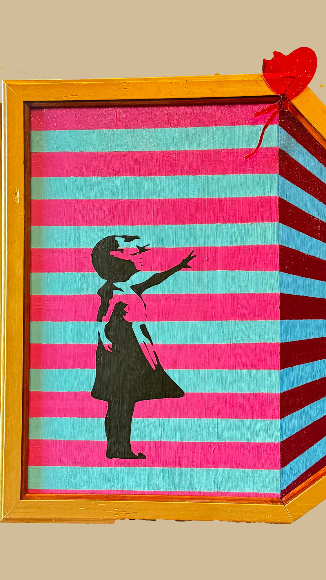 The artwork features a Banksy style silhouette of a girl in a dress, reaching out towards a red heart-shaped balloon, which is slightly detached from the main canvas and extends beyond the frame. The background consists of alternating pink and light blue horizontal stripes on the left side. In the center, the stripes shift to radiate outward in a starburst pattern, enhancing the sense of movement and depth in the composition. The piece is framed in wood.