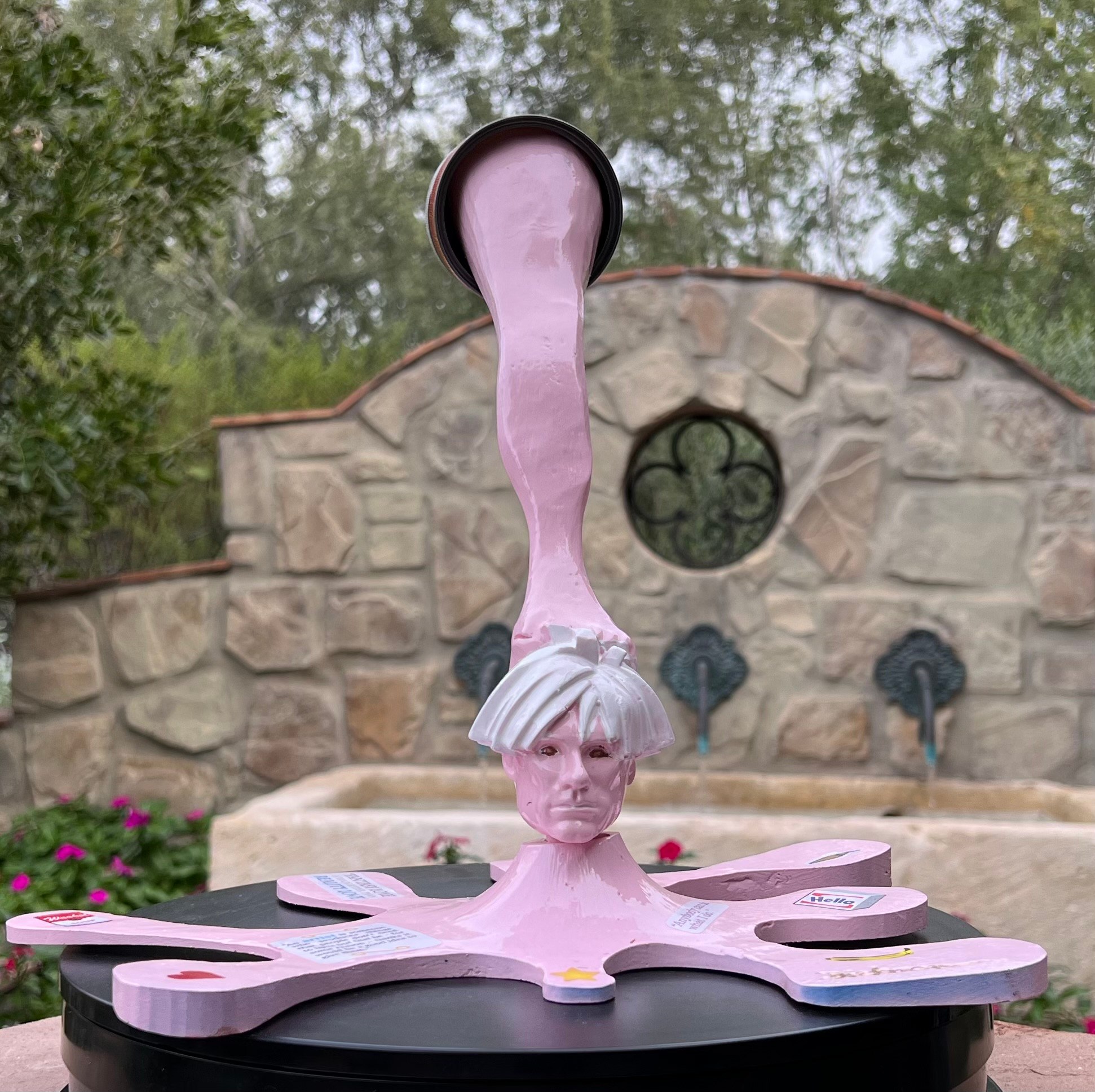SCULPTURE OF ANDY WARHOL ARISING FROM POURED CAN OF PRIMORDIAL SOUP.