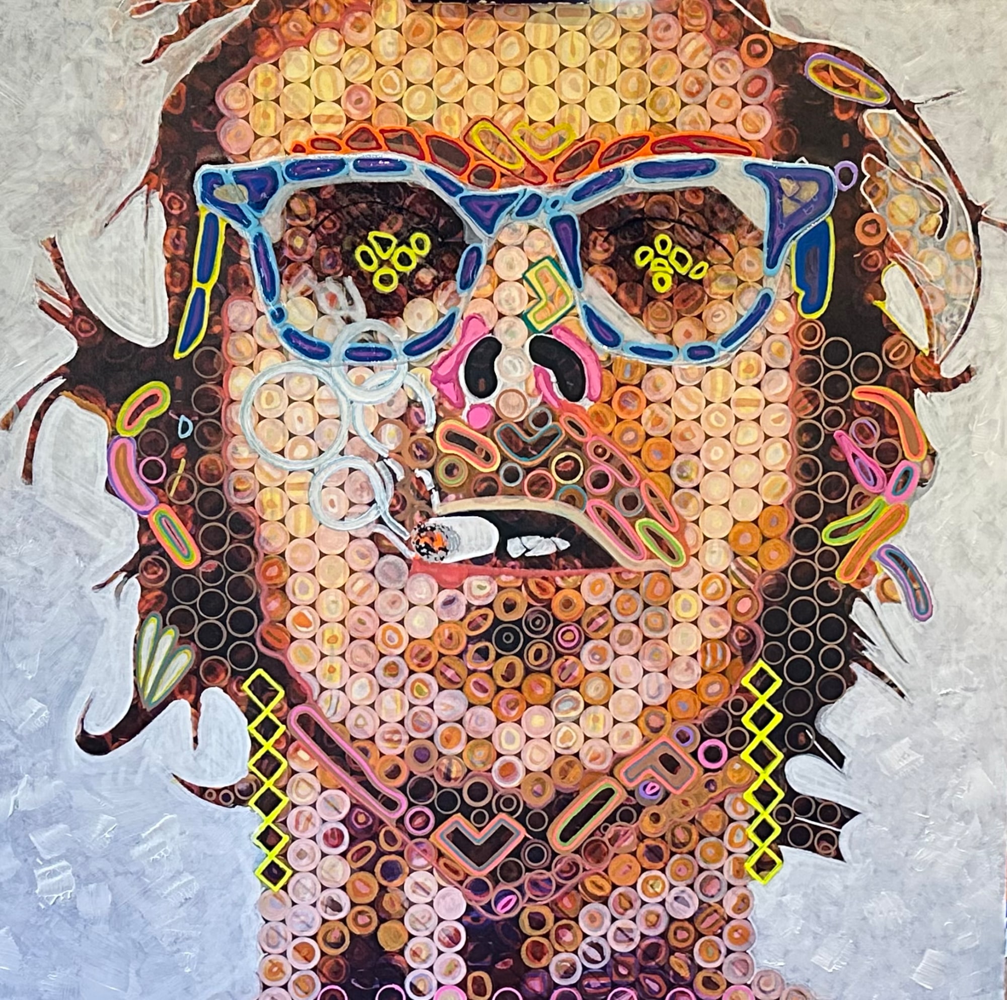 Mr Close developed a spinal cord stroke and paralysis in midlife and was confined to a wheelchair. After his stroke Chuck continued painting portraits, however his technique changed significantly to an abstract art form; he began painting portraits using geometric mosaic pixels which was vastly different from his earlier artwork. He created highly detailed abstracted representations of peoples faces.