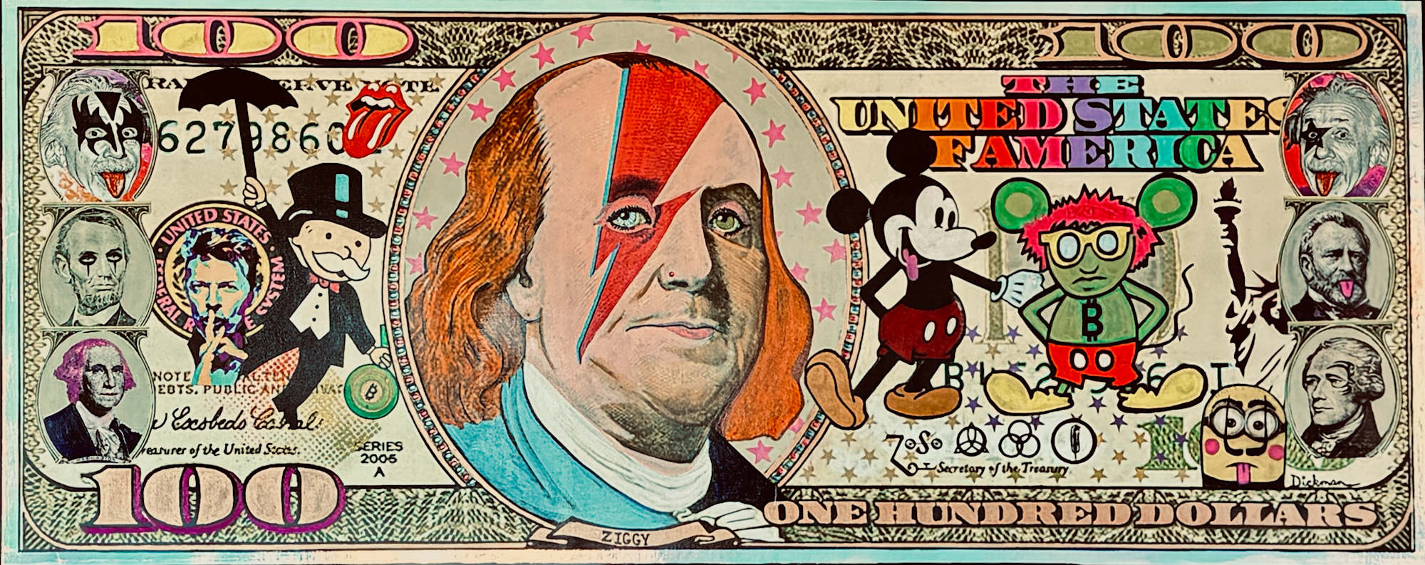 The artwork is a vibrant and colorful reinterpretation of a United States one hundred dollar bill. The central portrait of Benjamin Franklin is altered with iconic face paint inspired by David Bowie's Ziggy Stardust persona, featuring a striking red and blue lightning bolt across his face. Surrounding Franklin are various pop culture and political symbols, including Mickey Mouse and other cartoon characters in vivid hues, a stylized version of the Monopoly man with a top hat, and several historical and contemporary faces replacing traditional elements of the bill. The text "THE UNITED STATES OF AMERICA" is rendered in a rainbow gradient, and additional elements add a layered, rebellious essence to the piece. The entire composition is framed in an elaborate, decorative border, blending the familiar currency format with eclectic, playful, and subversive imagery.