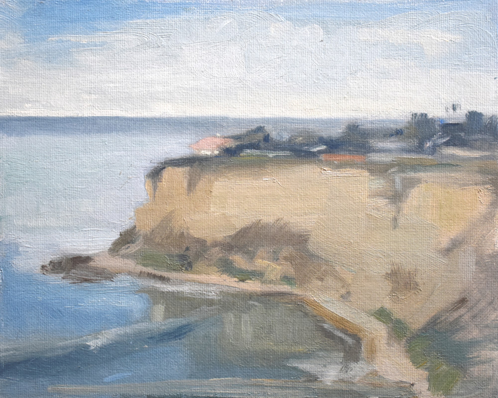 A small oil painting depicting a scene at Lunada Bay, Palos Verdes, CA. This painting was created on site while the winds blew in from the ocean,