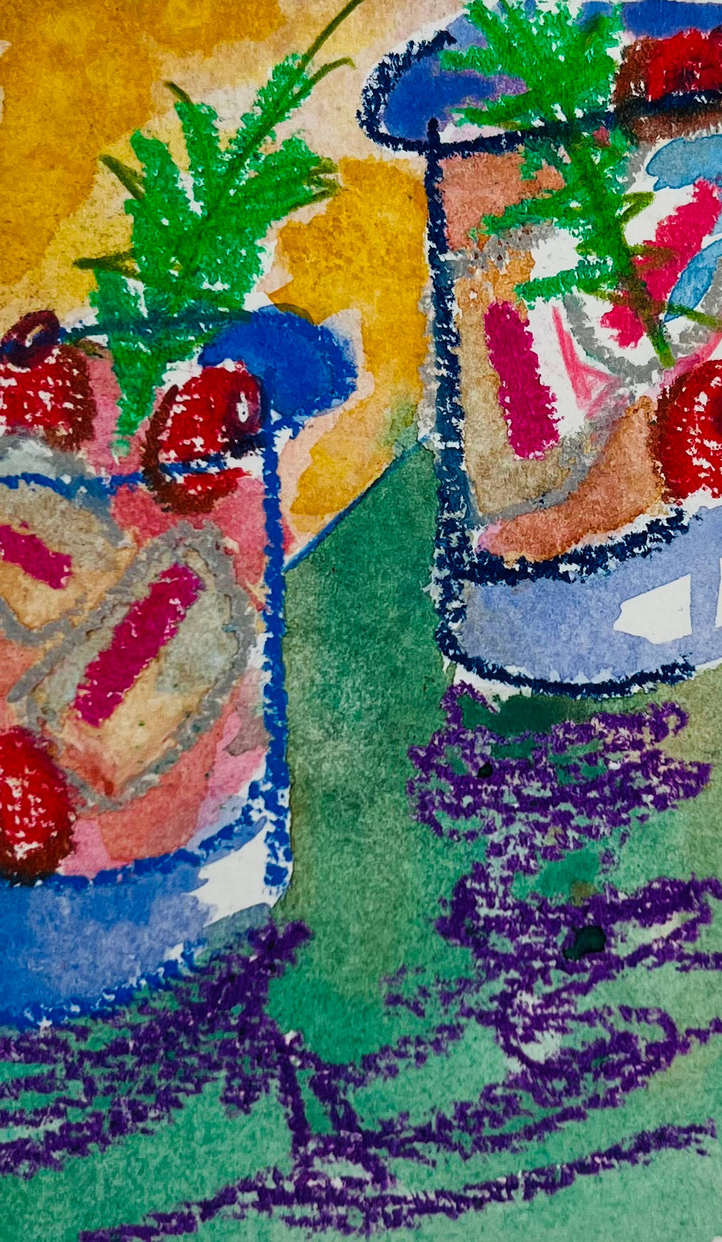 Original Watercolor and Oil Pastel on Paper. From the "Still Life of the Party" collection.