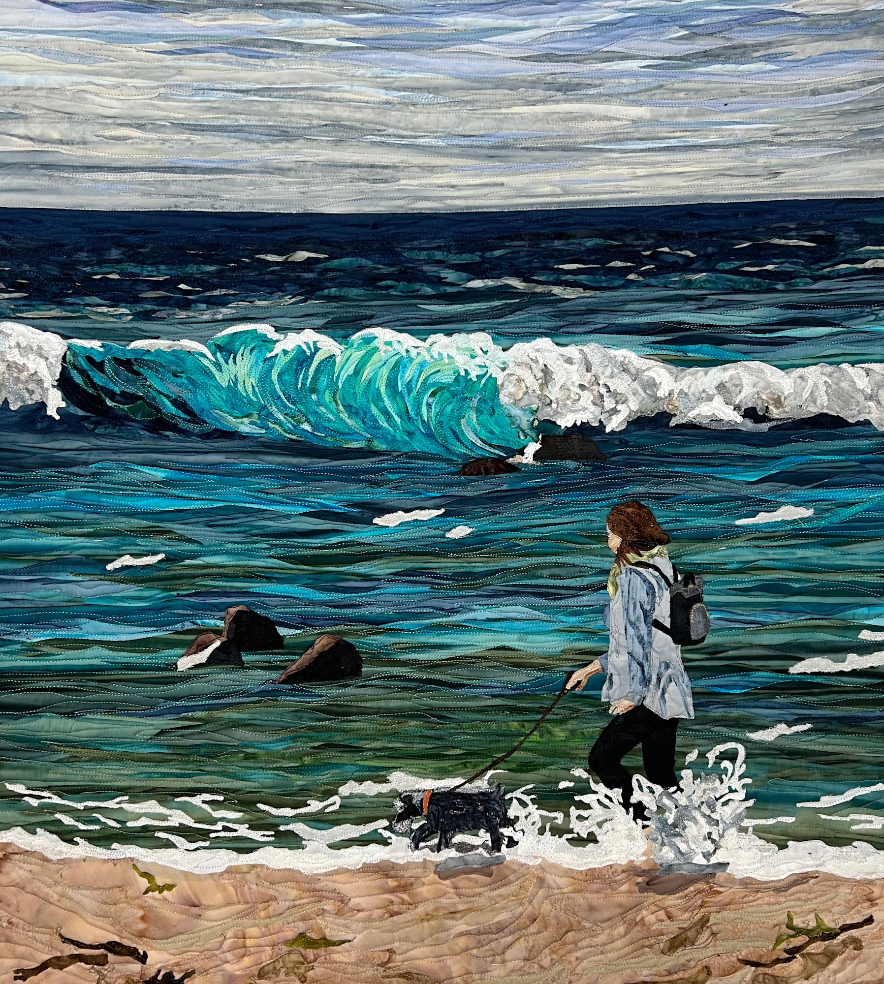 - Subject Matter: lady walking dog on beach.