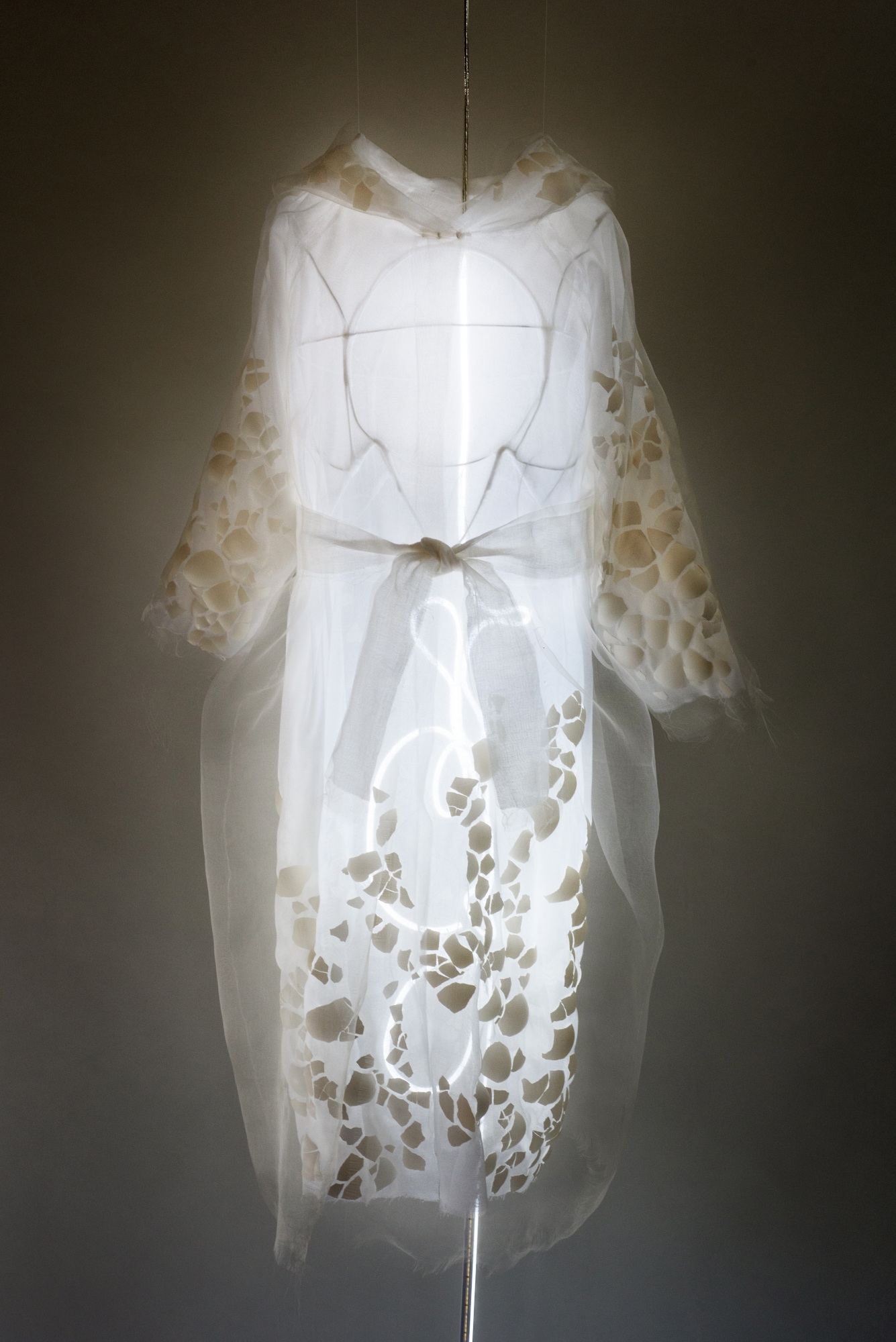 Mixed Media suspended child's bathrobe, made of eggshells, cotton and silk fabric, wire armature, and electric LED lighting.