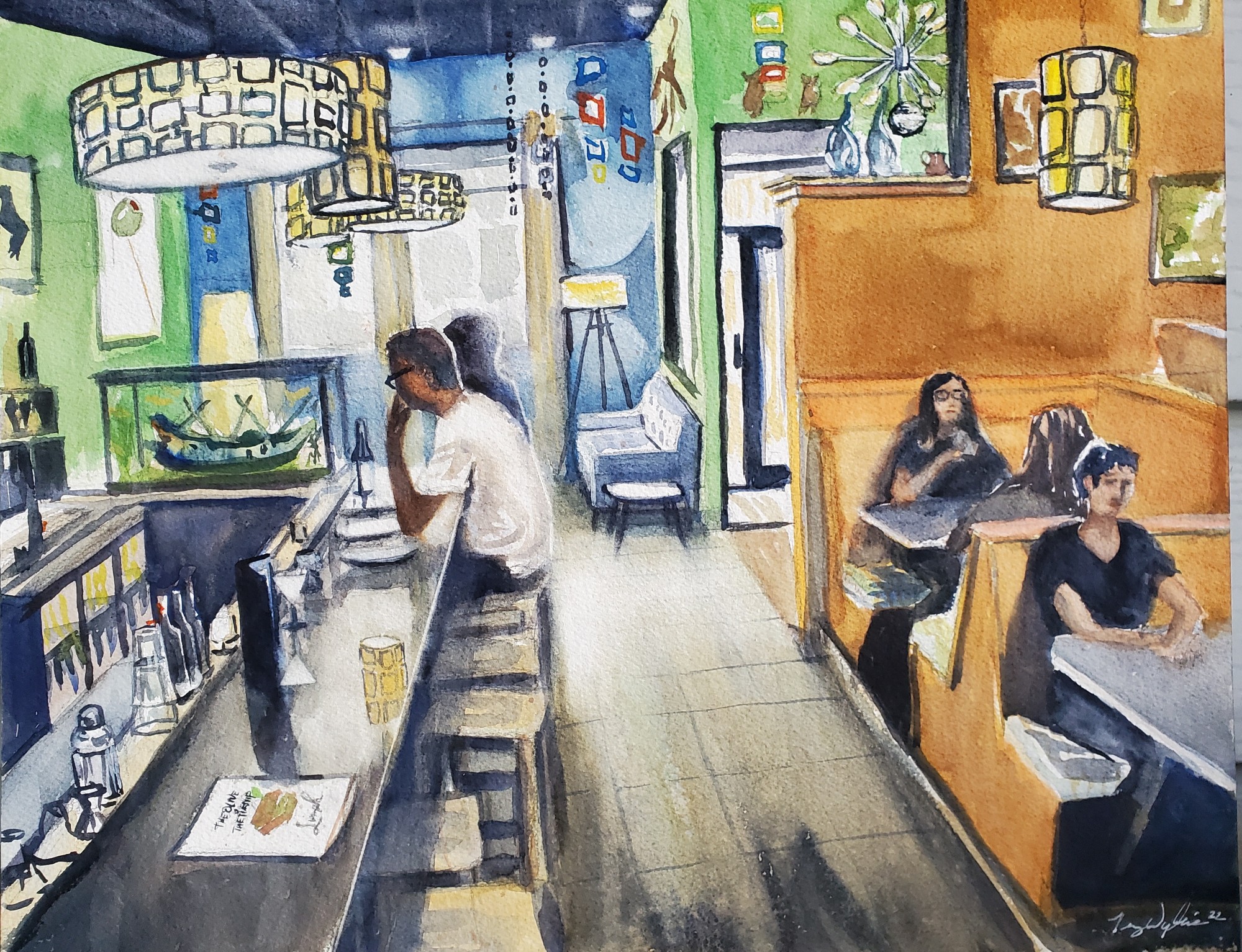 "Meet You There" captures the vibrant 1960s Astro Lounge atmosphere of the "Mod Olive" restaurant, painted on location during the Suffolk Plein Air Festival. Backlit with colorful light fixtures and lamps, the scene exudes retro charm, with 60s sitcoms on TV, creating a playful, nostalgic setting full of energy and fun.