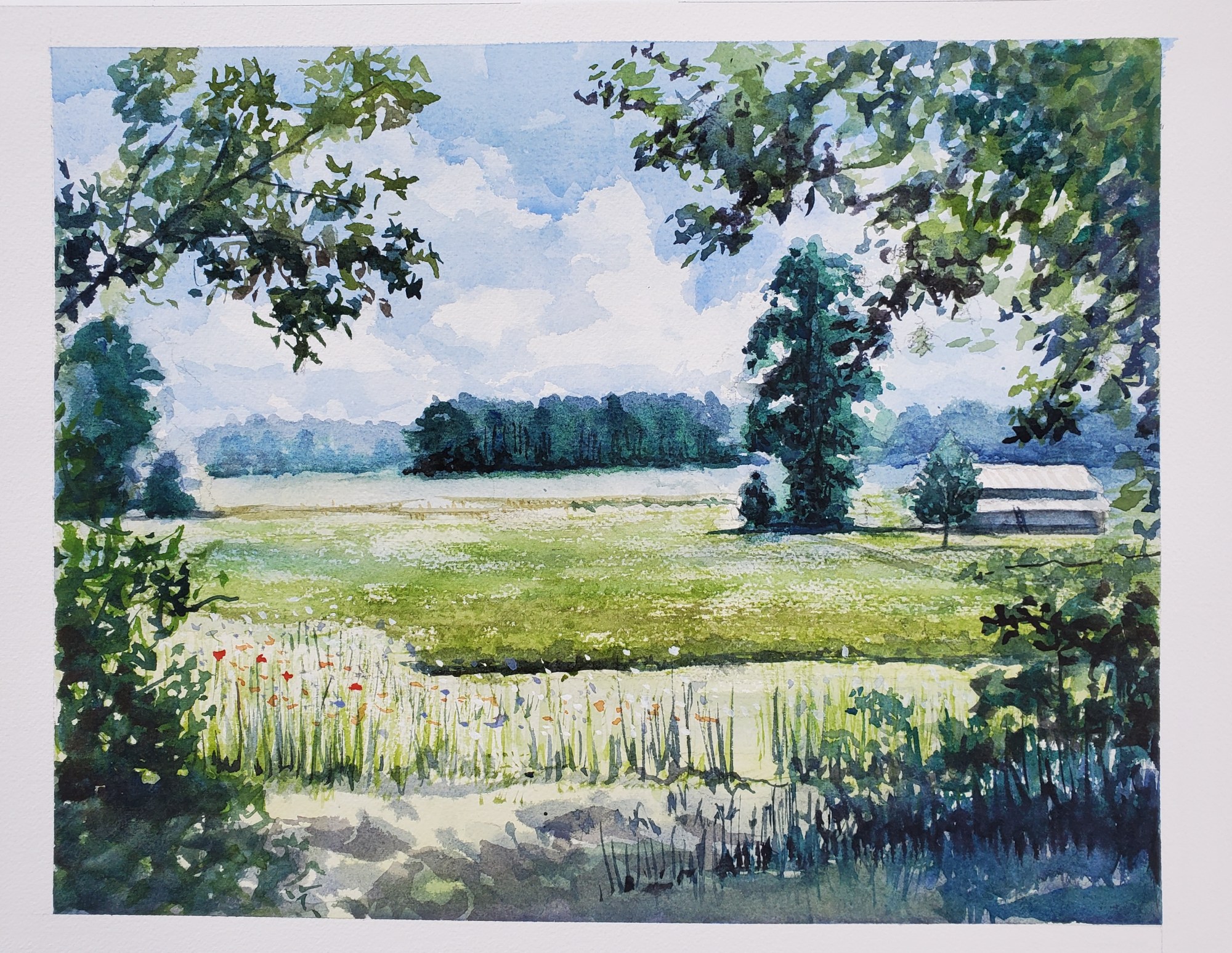 A plein air watercolor capturing the vibrant "Nowhere Flower Farm." Sunlight bathes blooming wildflowers with fields stretching under an expansive, bright blue sky.
