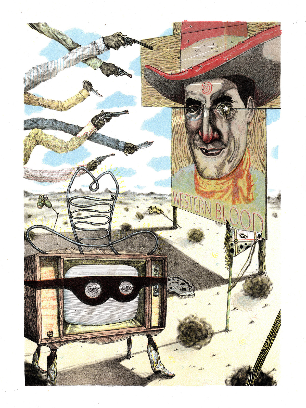 Color Lithograph in 6 layers (black, tan, red, yellow, blue, gray) from stones and photoplates.