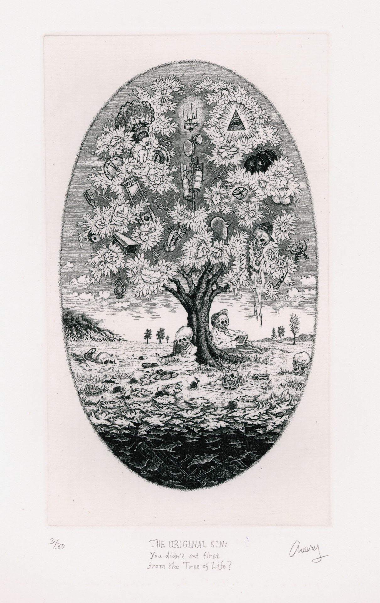 Perhaps eating from the Tree of Knowledge of "Good" and "Evil" first was not our best choice...Framed price is $490.00, unframed is $350.00. Actual title: THE ORIGINAL SIN: You didn't eat first from the Tree of Life?