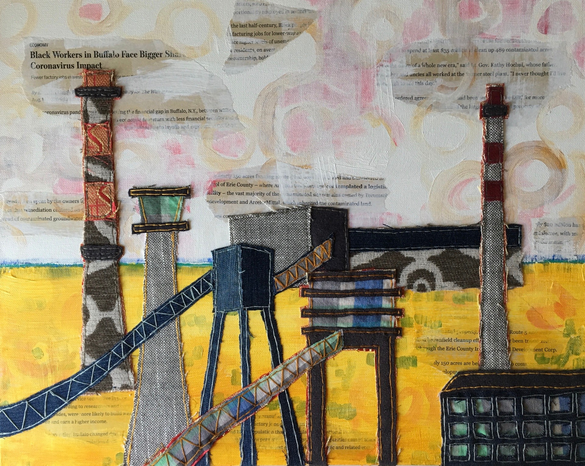 Stitching together my own old clothes and recycled fabrics into an abstracted factory scene - with recent articles about Western New York's revitalization and ongoing challenges pasted into the background - this piece reflects on both my own and my hometown's current hopes and struggles.