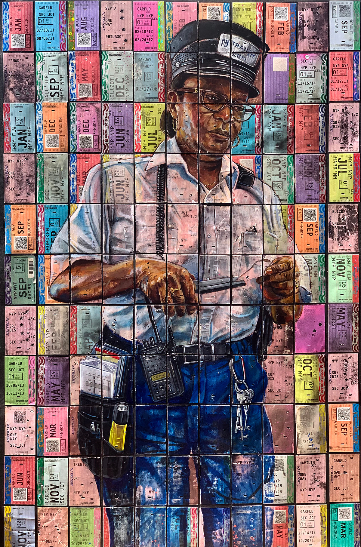 Commuter Railroad ticket collector painted on top of rail tickets on canvas