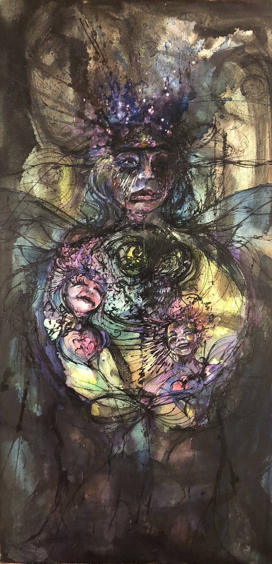 Mixed Media includes layers of black acrylic, watercolor and coffee to represent a Mother holding her children tight. Protection. Profound strength.