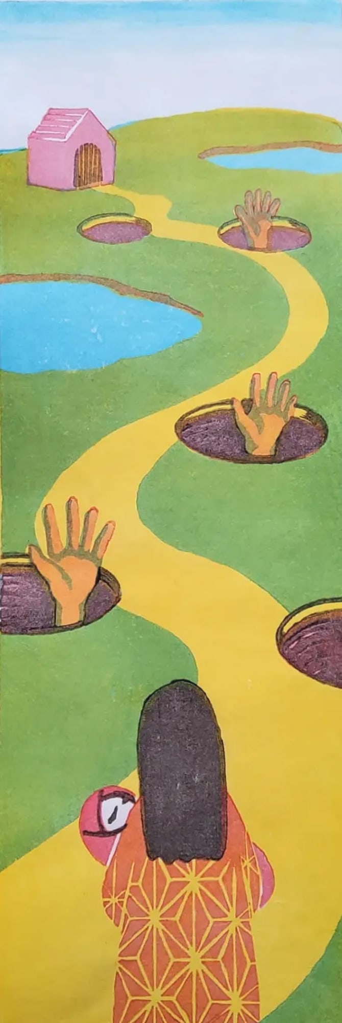 The hands coming out of the holes represent those who wanted help from me as I served them as a mental health therapist. As I stopped to help them, my road home grew longer. When my daughter was very young, I’d rush to my car at the end of the day, hoping that she wouldn’t be the last child picked up from preschool– in my