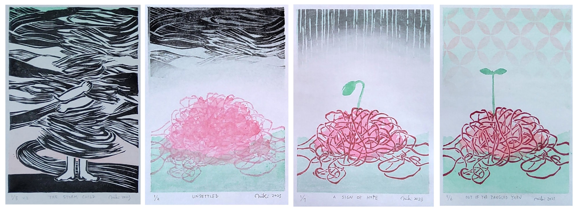 At the time of the event, a storm arrives.It leaves unsettled feelings and sensation. There is a ball of tangled yarn left inside of you. You may not know what it is or what's in it. As you explore it, you see a sprout coming out of it. Maybe what happened to you means something--something important.May you find the true meaning of what happened to you, out of the tangled yarn.