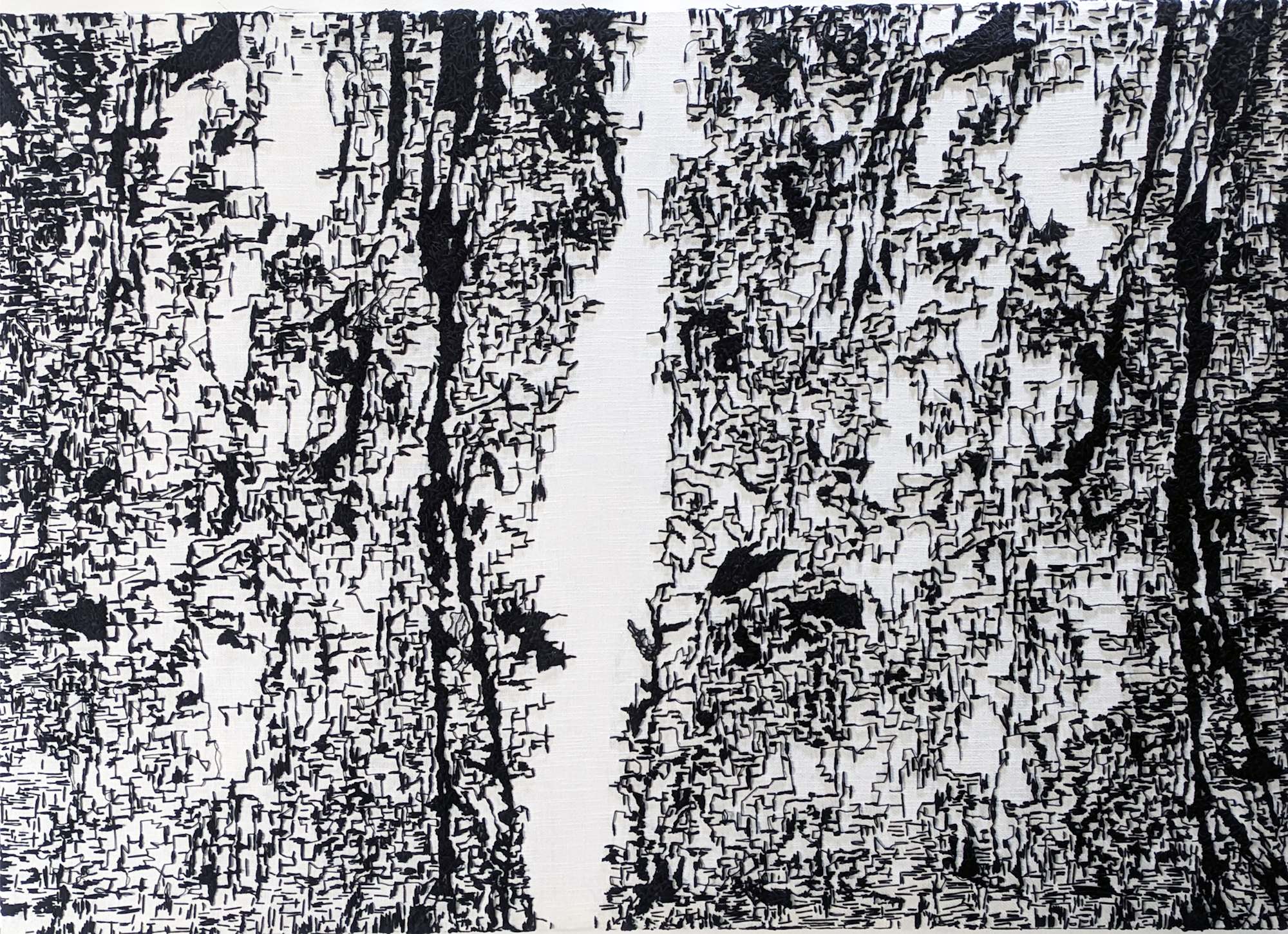 En la superficie se despliega un tejido de signos que parecen pertenecer a un idioma olvidado. El origen —una cascada de agua— se ha desdibujado, quedando solo su sombra convertida en trama. Los hilos negros se entrecruzan como trazos de una escritura imposible, un alfabeto sin traducción. La obra conserva la vibración del flujo, pero en silencio: un eco visual donde el agua se volvió palabra y la palabra, ruina.