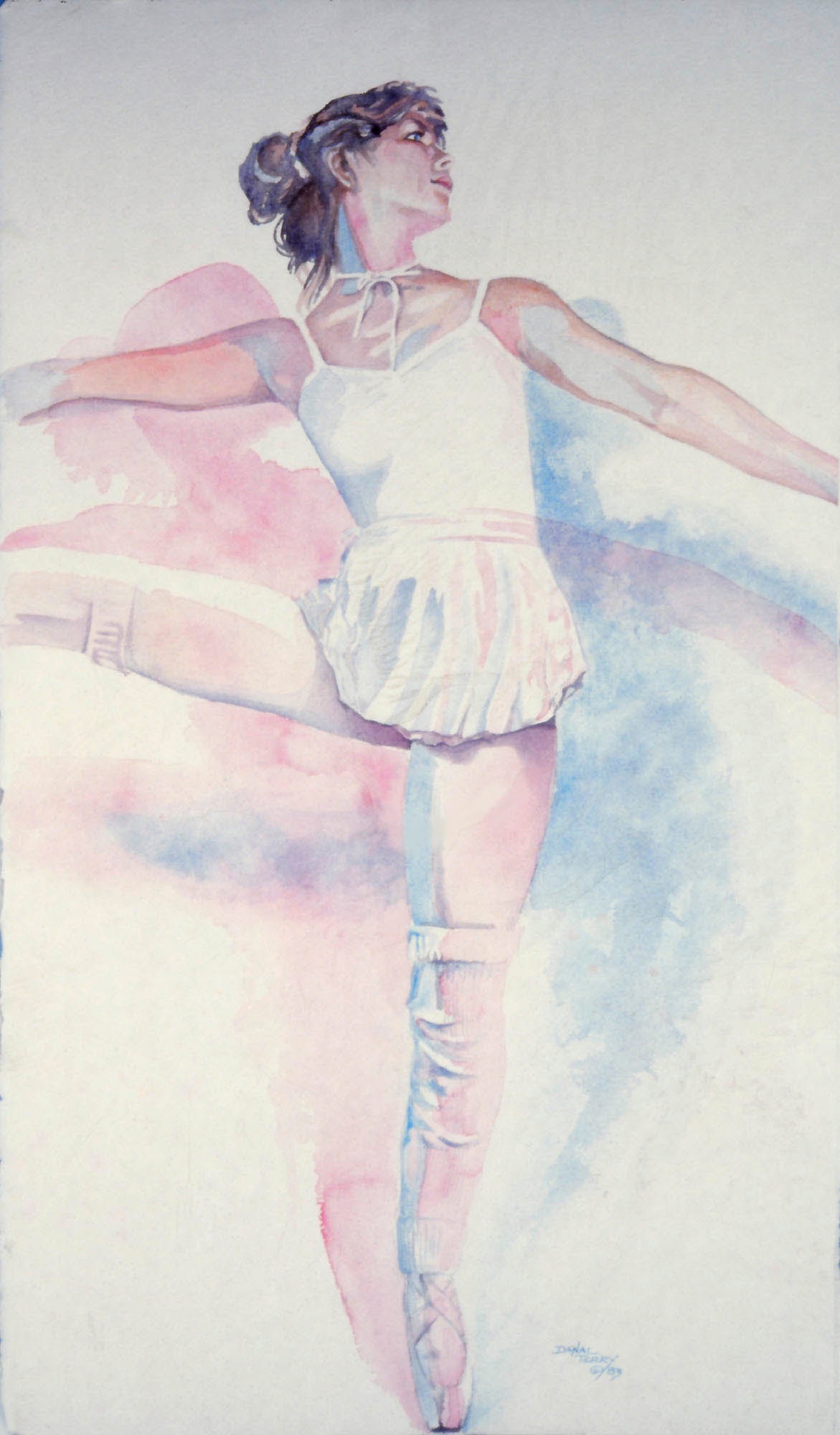Dancer in White figurative ballerina in rehearsal from original watercolor done in 1983. This limited edition of no more than 100 giclees on heavy duty watercolor paper is printed entirely by the artist in his studio at the same dimensions as the long lost original. As such it is as faithful to the original as can ever be created.