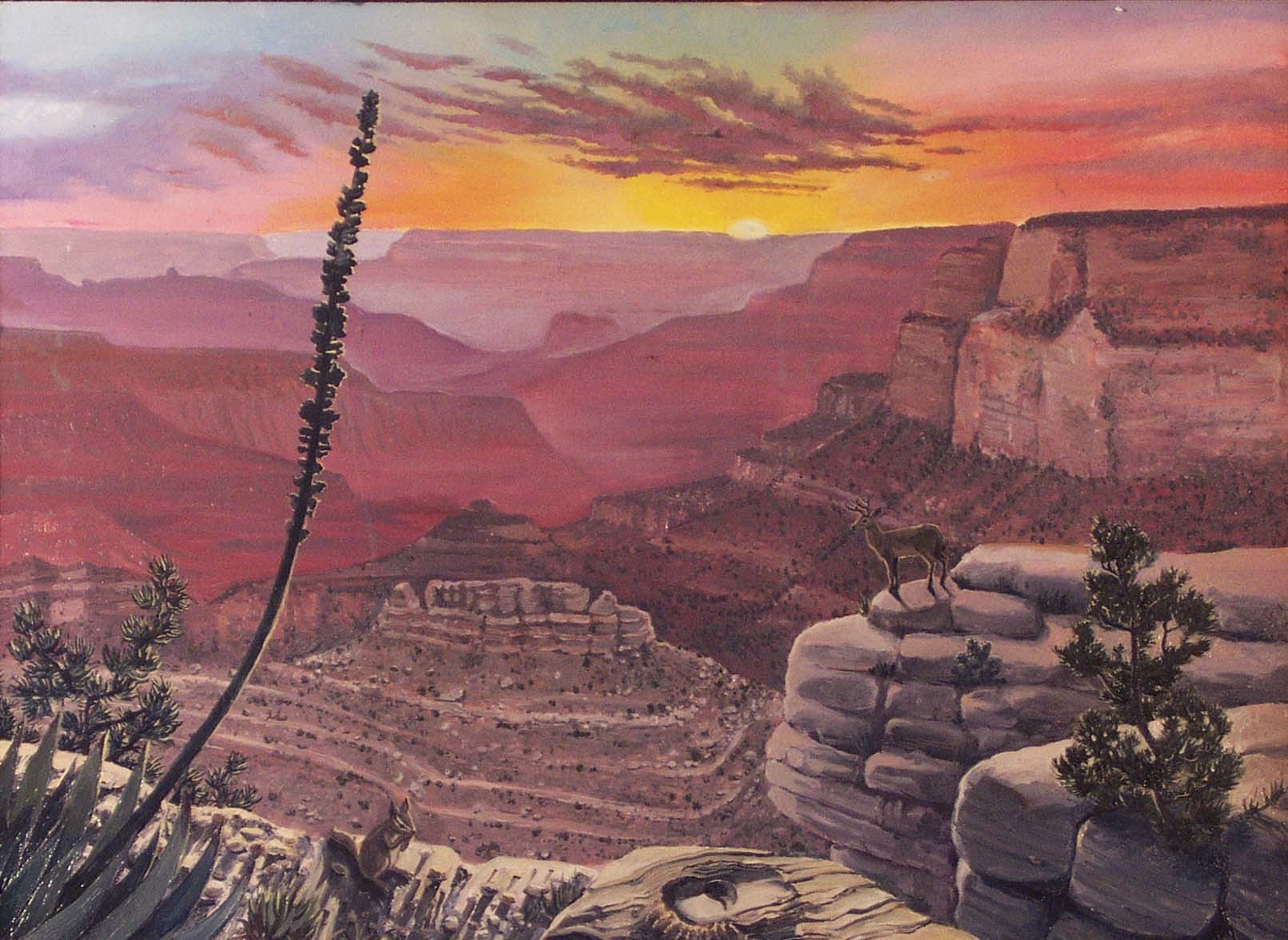 Another of the rare, still existing, Dan Terry original oil nature landscape paintings, done back in the mid 1970s on a wooden panel before he embarked on much larger scale works like the murals he's best known for. This moody sunset view from the south bank of the Grand Canyon measures a mere 18x24", a tiny work compared to his more recent canvases.