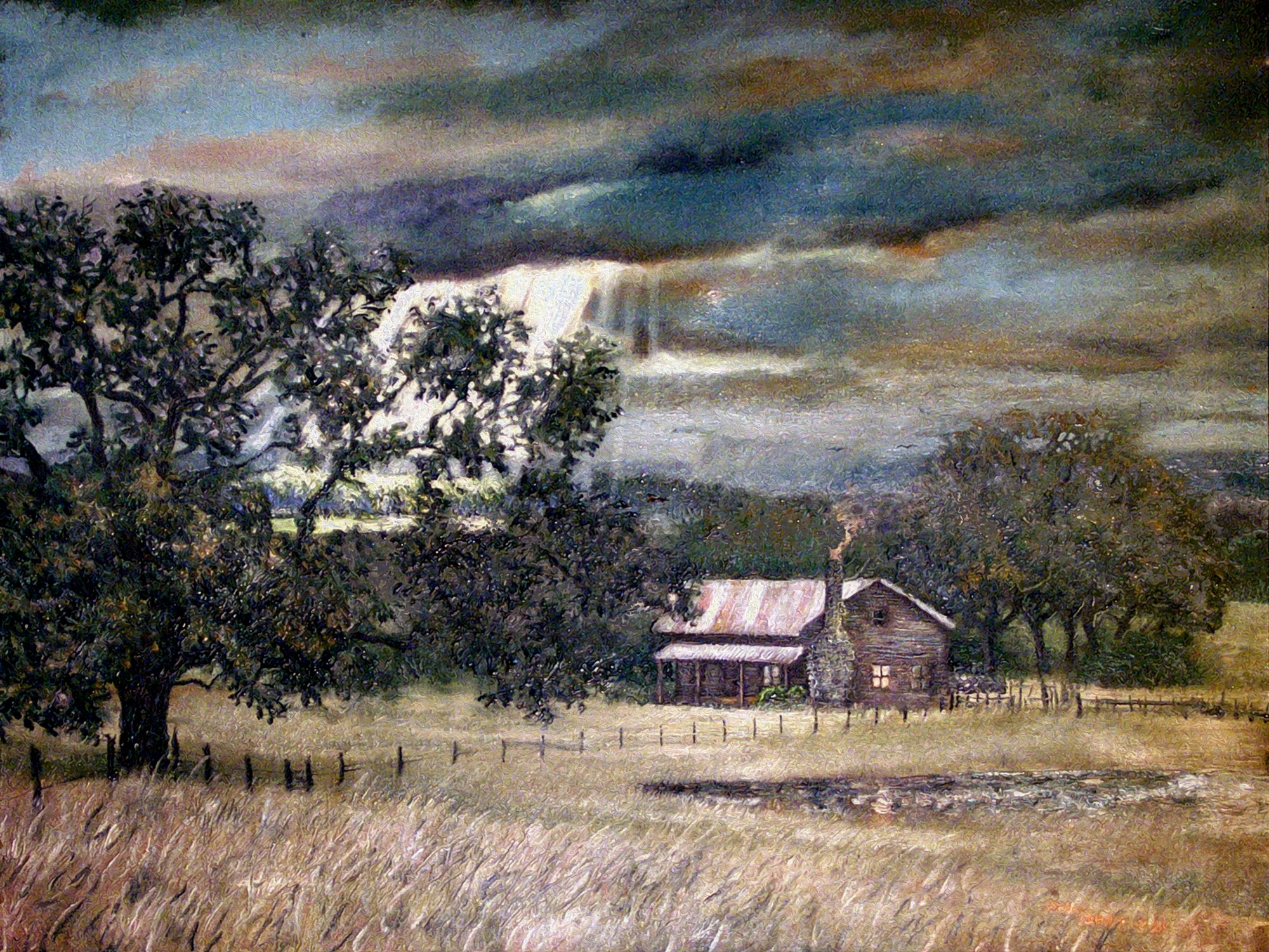 Rural Winter Texas Landscape w/Cabin was created circa 1976 and it's current location or even existence is unknown. Might have been one of the works destroyed in a flood in San Marcos or even sold (though it's not likely as few works from that time period were). It was exhibited at the artist's short lived gallery space on the square in San Marcos around 1976 and in a few outdoor art fairs during that time frame. The original is an oil on canvas at a likely size of 18x24" a small work for the artist based loosely on the cabin and landscape in which the artist lived upon first coming to Texas when he was the overseer on a small ranch in Normanna. The cabin itself burned to the ground during the first winter freeze when a wood burning heater's spark escaped a upside down chimney pipe installed by the ranch owner, Mr. French, from Corpus Christi on or around Dec 7, 1974. While the artist woke up after midnight from the smoke and managed to escape with one guitar and his cat through a window, the entire structure collapsed within minutes of getting out with no means of calling the nearest fire department some 17 miles away in Beeville. Lost were about 20 original works created by the artist in his earliest years of painting and virtually all personal possessions. The mood of the painting captures the gloominess and cold of that first Texas winter in the south Texas ranchland where he lived for another few years in a shared 20' long tin shack with two Mexican nationals while working on the ranch, during which time he bicyled several days a week to Beeville to attend art classes at Bee County College taking courses under mentor, Simon Michaels (1905-2002).