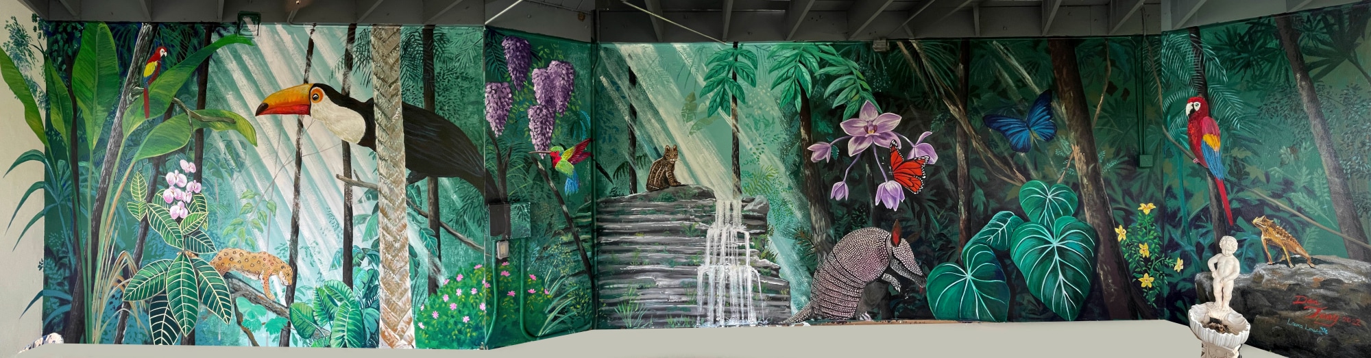 This commissioned mural "Tropical Forest Fantasy" adorns a beautiful semi outdoor patio for a health clinic developer's home near Austin, TX. The work is 8' tall by nearly 70' long done entirely in Acrylic artist paints, done in 2022. Some of the featured creatures in the work are an endangered Ocelot, 9-banded armadillo, toucan, ruby throated hummingbird, and a threatened Texas Horny Toad. Orchids, Wisterias and a host of other tropical plants and flowers add brilliant spots of color.