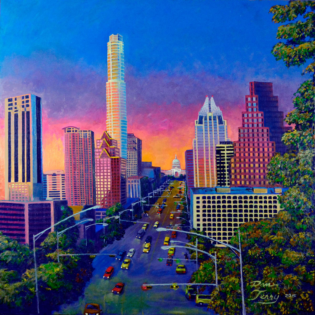 Austin Sunset depicts a moment in time of the ever changing Austin city skyline done over a year's time in 2015. Its mood evokes a sense of loss and nostalgia for the city known for it's artistic environment that nurtured creativity and innovation, as the tech industry growth and rapid development of the downtown into a major metropolis replaces much of its historic buildings and drives it's creative artist class further and further from the city's core.