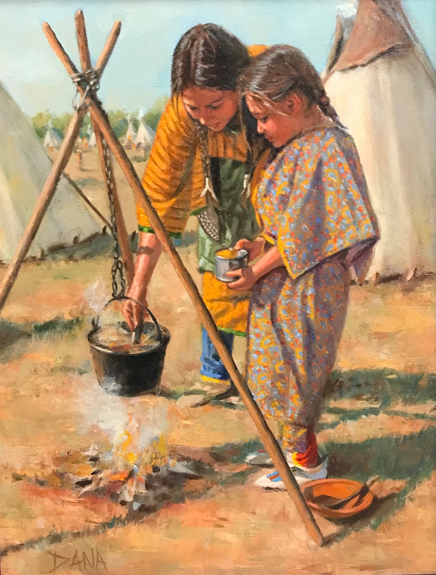 This is a scene from a Cheyenne camp depicting a mother and daughter cooking over an open fire.