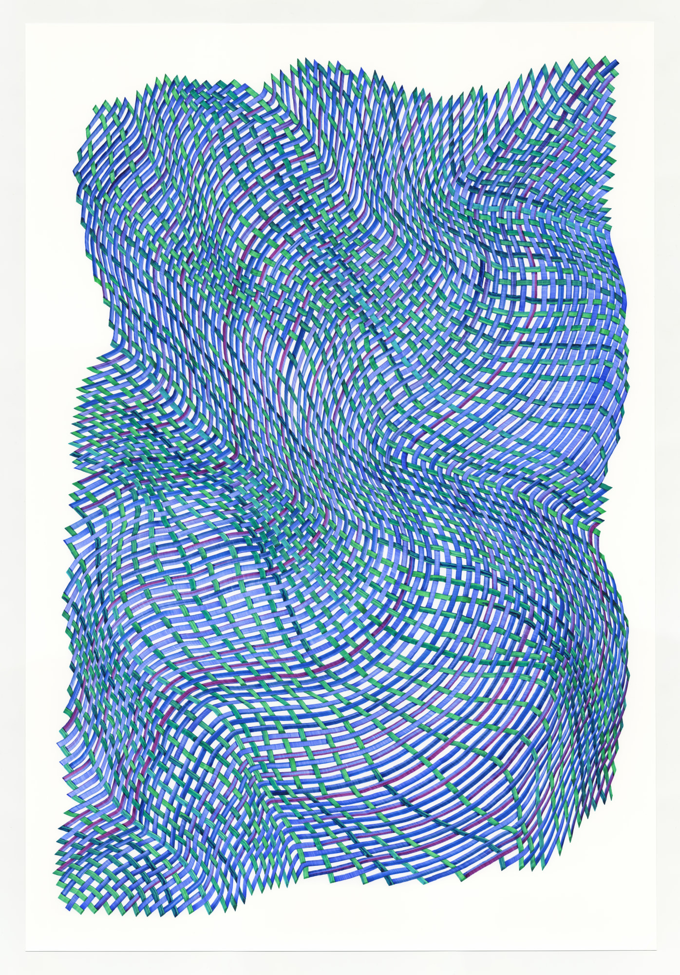 Golden High Flow acrylic, Ultramarine Blue, Indigo (Anthraquinone), Cerulean Blue Hue, Teal, Permanet Green Light, Turquois (Phthalo), Permanet Violet Dark, Phthalo Green (Blue Shade). 6.0 mm parallel pen.