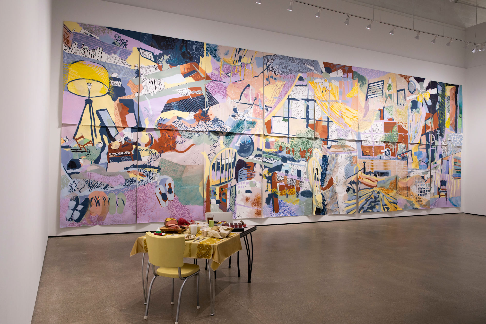 This work presents layered imagery of spaces and objects inside the 550-square-foot apartment that I share with my partner and our cat. Aspects of the apartment merge with creative manifestations of my mind through use of color, pattern, material, and perspective in the form of a large-scale, multi-panel painting. Abstracting these mundane aspects of my everyday life using paint and mixed media, I contend with our apartment as a holding space for both my body and my mind.