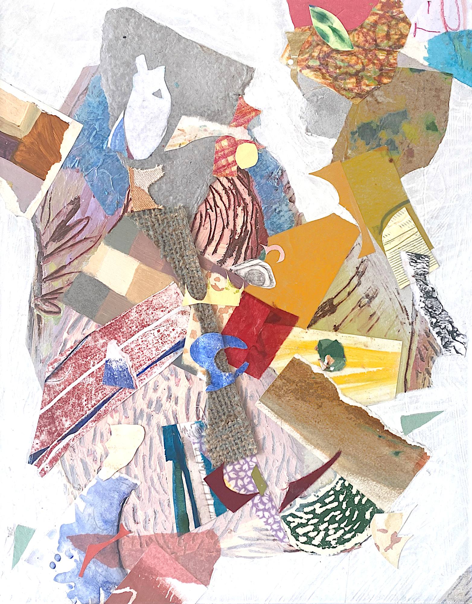 Using a diverse array of collage materials, I enlist gravity's help to compose this series. After selecting my collage materials, I relinquish control and let them fall where they may—literally. In doing so, I suspend my thoughts and conditioned habits, resulting in outcomes more interesting than I could have imagined. Once the procedure is complete, I reclaim the power of assigning meaning, as we humans often do.