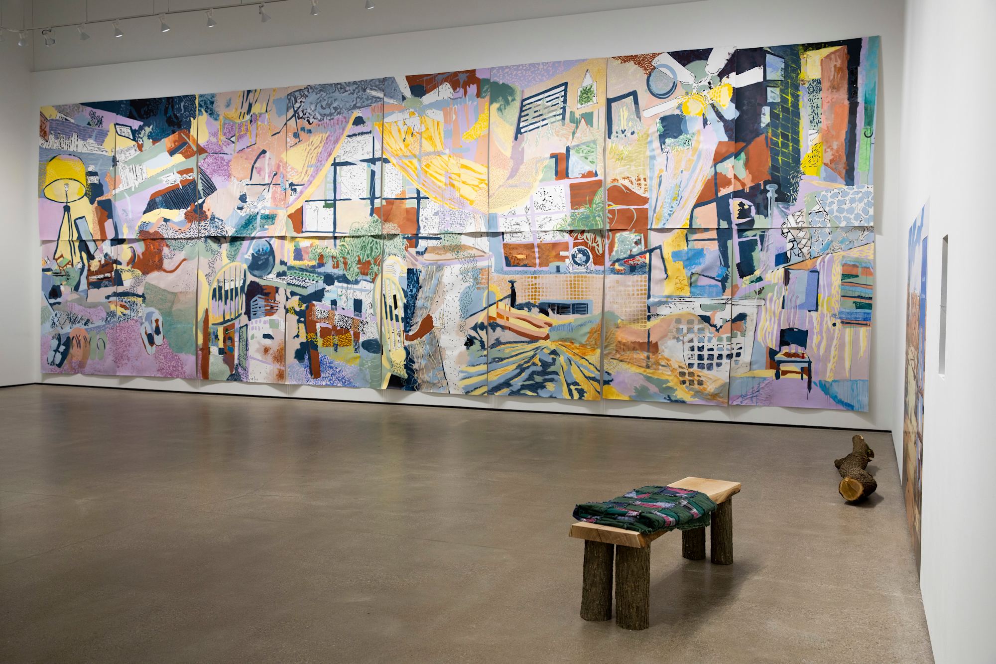 This work presents layered imagery of spaces and objects inside the 550-square-foot apartment that I share with my partner and our cat. Aspects of the apartment merge with creative manifestations of my mind through use of color, pattern, material, and perspective in the form of a large-scale, multi-panel painting. Abstracting these mundane aspects of my everyday life using paint and mixed media, I contend with our apartment as a holding space for both my body and my mind.