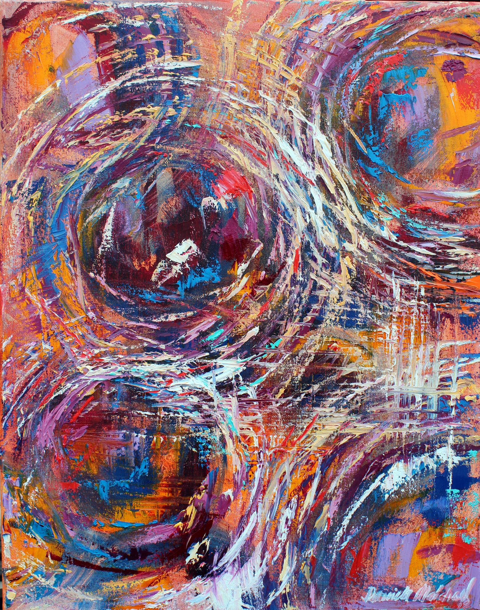 The focus is on the element, color and paint interaction on this piece. One may want to look closely at this painting and be caught in the intertwined strokes of the paintbrush and palette knife. From afar one catches a glimpse of the greater image almost as if looking through a microscope.