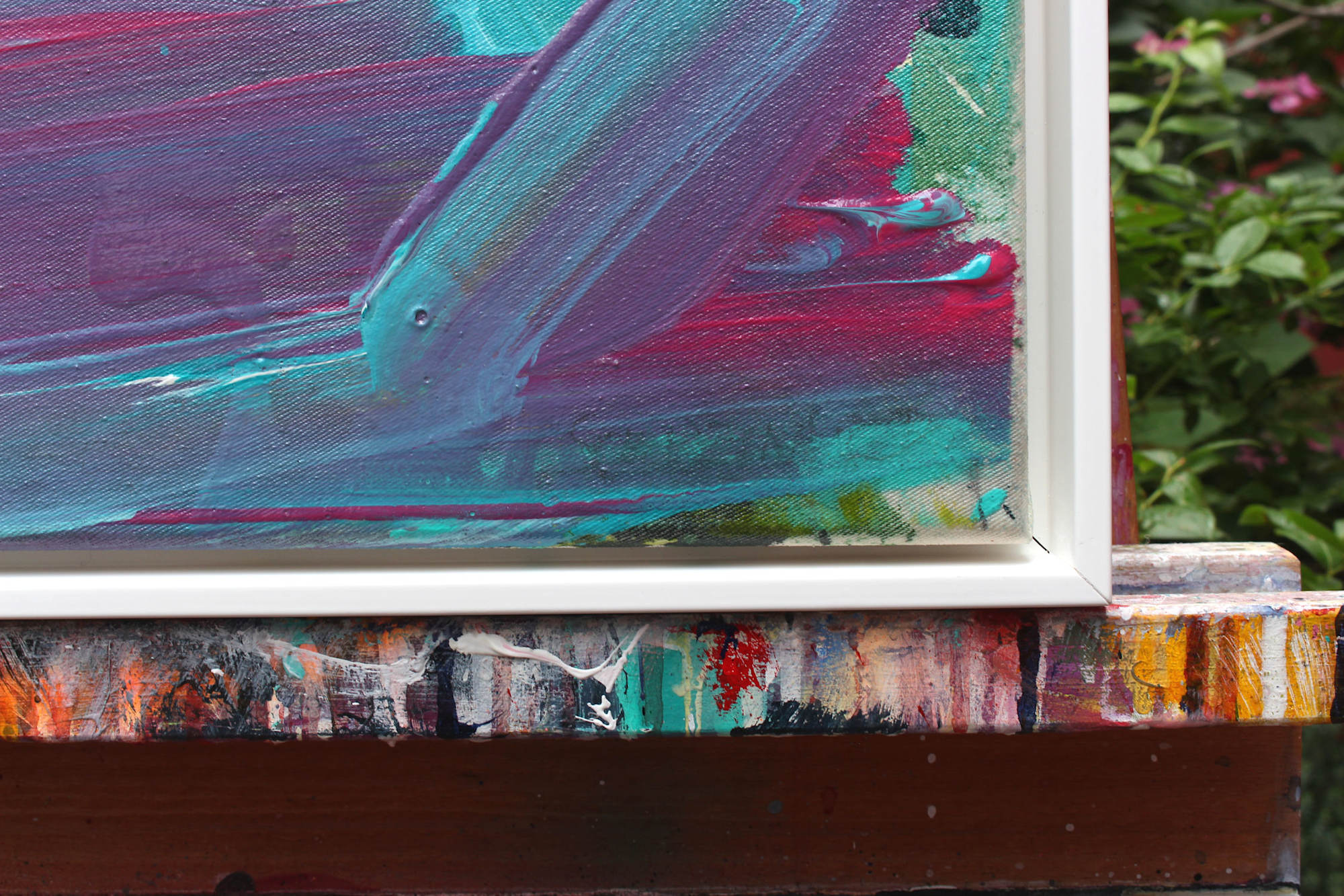This work thrives on its tactile presence — creamy, physical, full of movement. The paint is applied thickly and generously; brushstrokes are clearly visible and gestural in nature. Turquoise and soft cream tones dominate the composition, interwoven with dynamic lines and flowing transitions that create depth and rhythm.