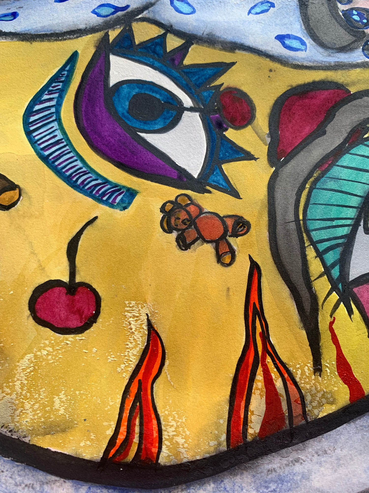 The Circle of Fire figurative expressionist watercolour painting and is a journey into mental illness .