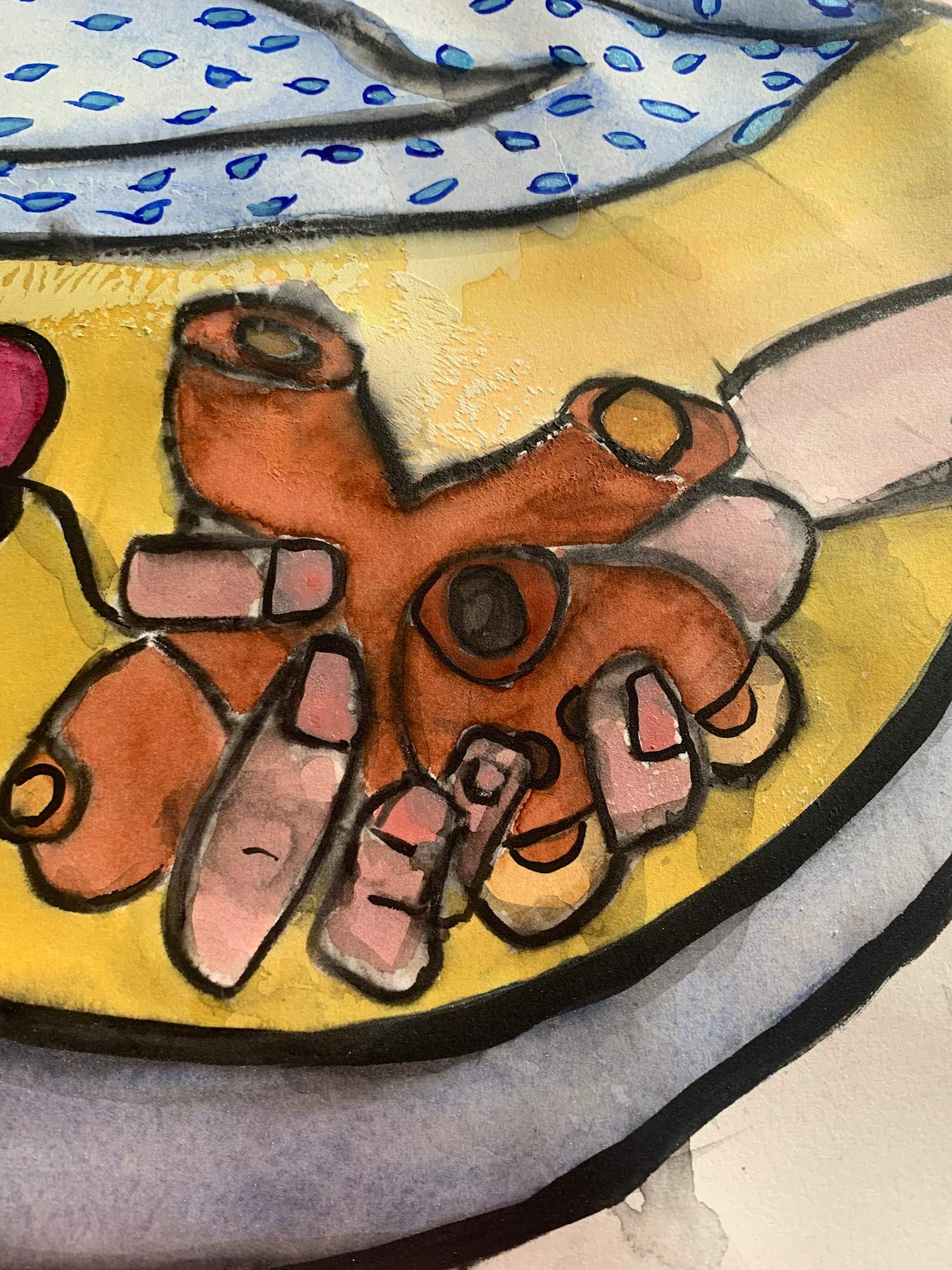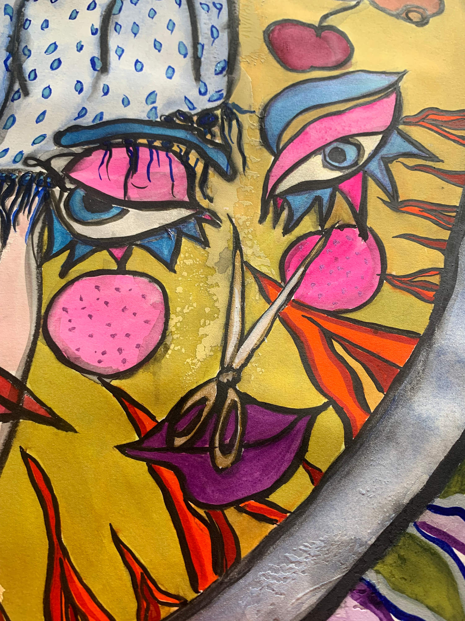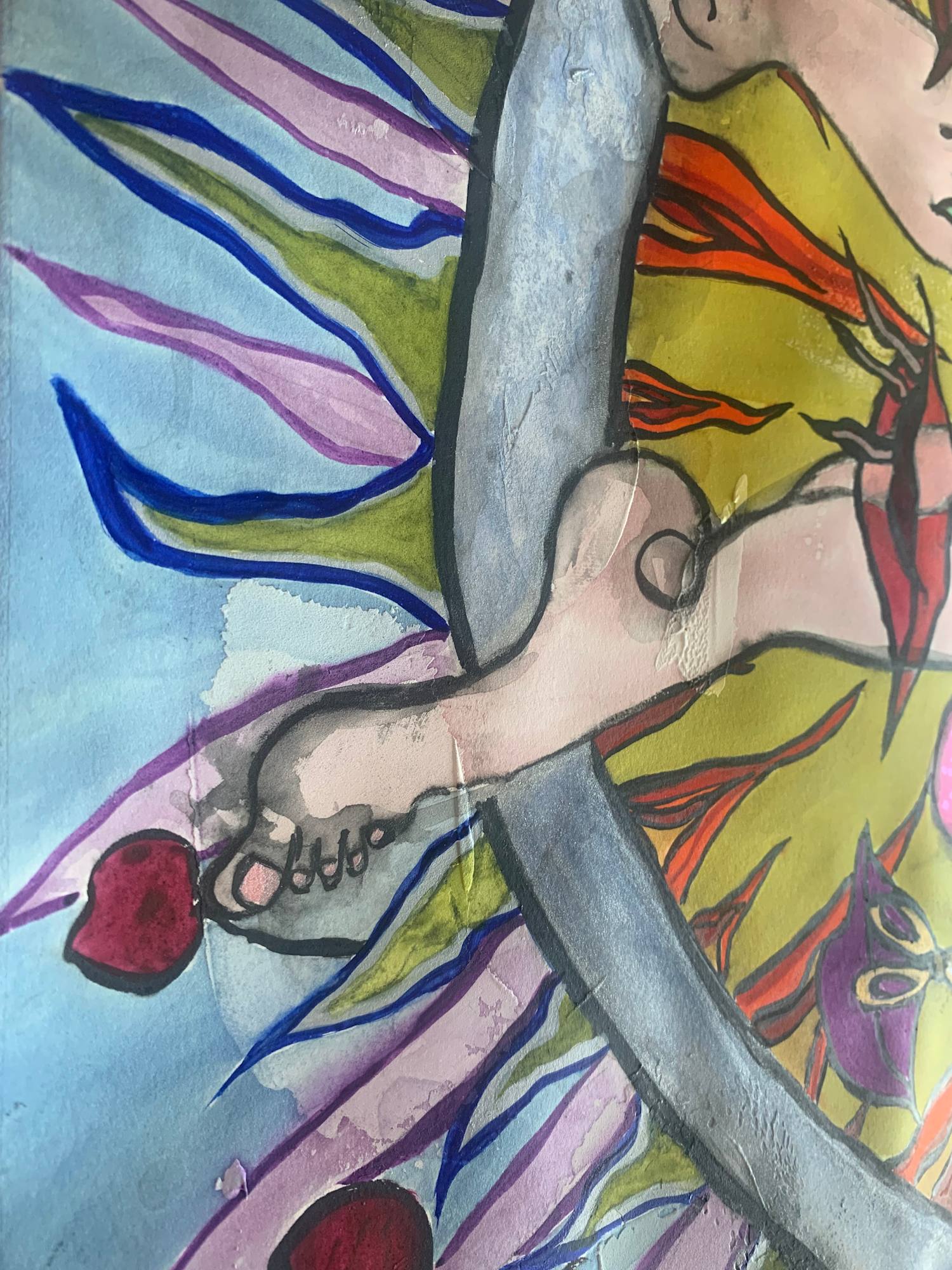 I have witnessed one of these moments of despair.“The Circle of Fire “ is an allegory to my experience where his angst reaches dangerous levels that words won’t start to express his dread and he needs to feel something. Tommy is depicted here in my watercolour painting in my usual figurative expressionist style in one of these moments, feet out of the circle of fire the second half of his body is struggling to remain in the secure zone. It's torture and his mind is being harassed, the confusion needs validation and mutilation reminds him he is real. Pain is a form of conversation. There is light and darkness as in everyone’s life, the depth of which is impossible to judge and mental illness is just one step away.