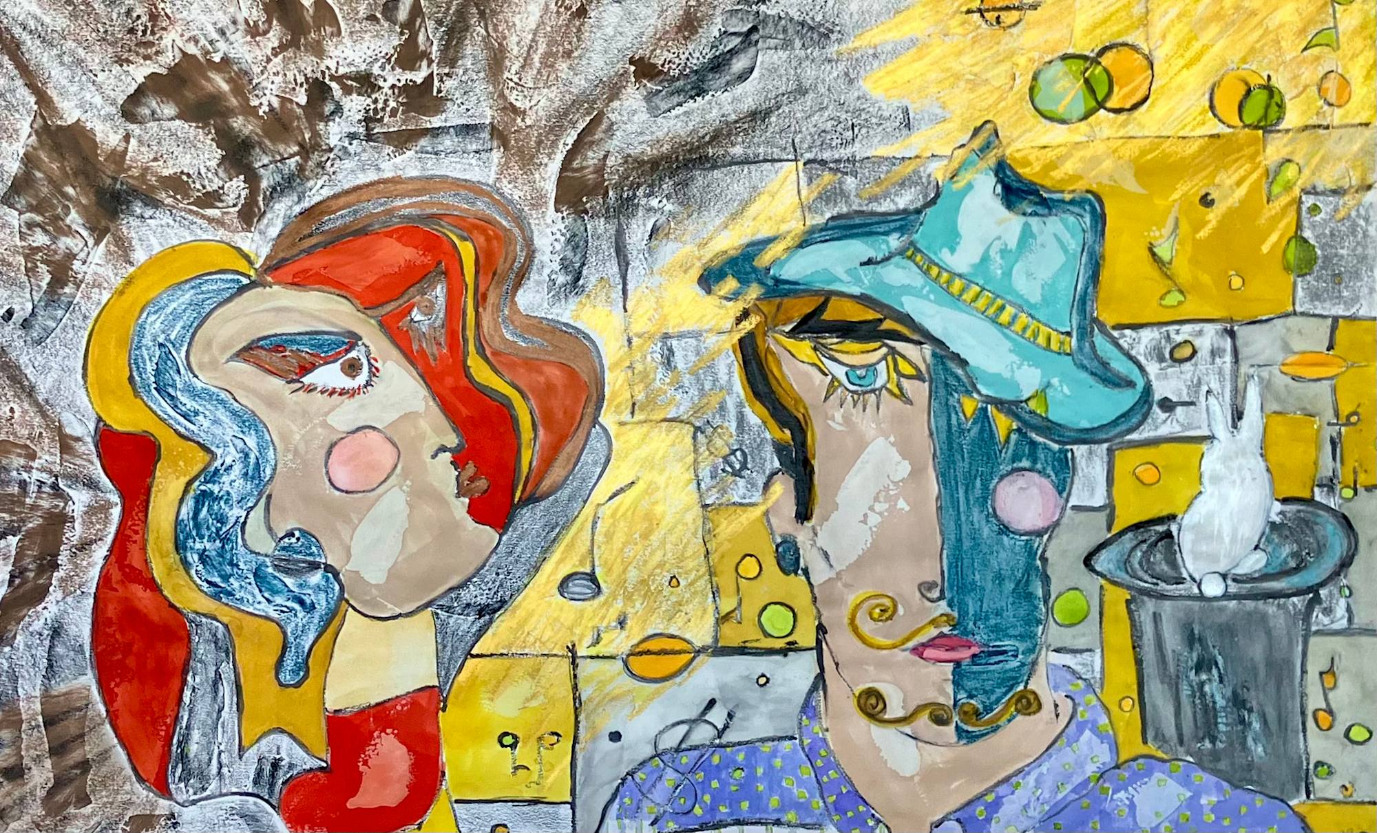 She is the star of a small jazz club he is the casino entertainer . Mesmerising couple, entertainers, performers the night life belongs to them. "Inspired by the fluidity of expressionism and the delicacy of watercolours, this mixed media painting captures the magic of a jazz singer and a magician. Their captivating performances light up the stage and bring vibrancy to the nightlife. Become mesmerised by the enchanting couple and immerse yourself in the world of art and entertainment."