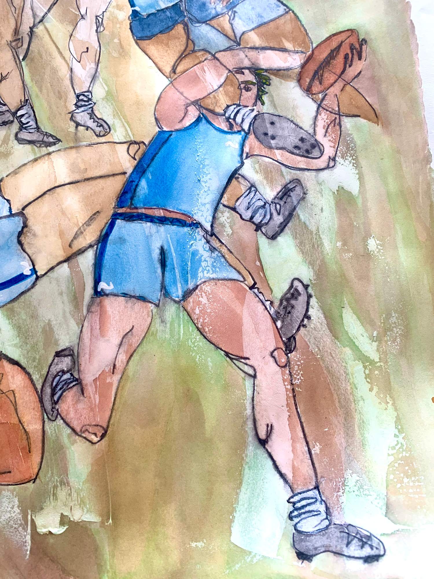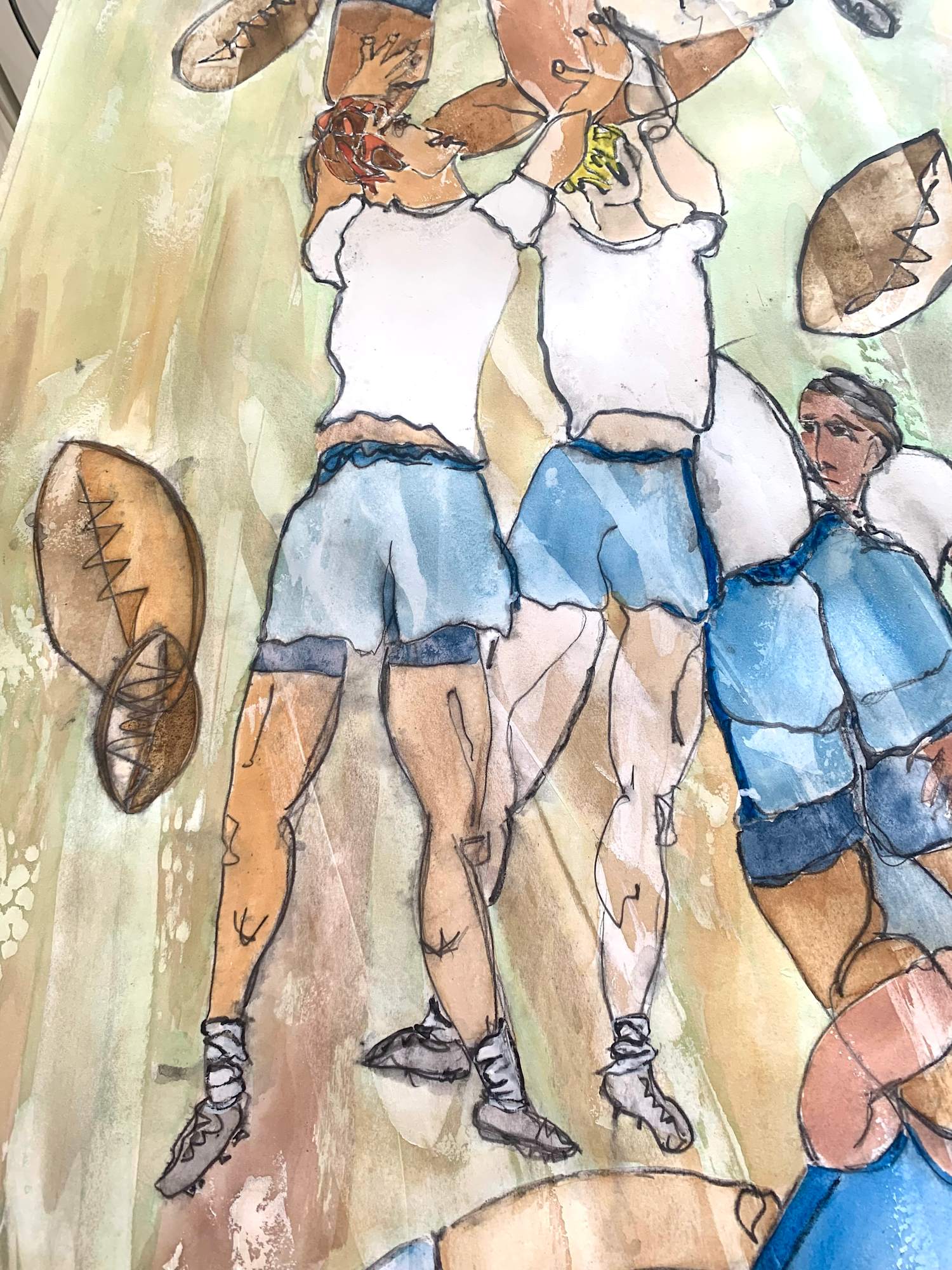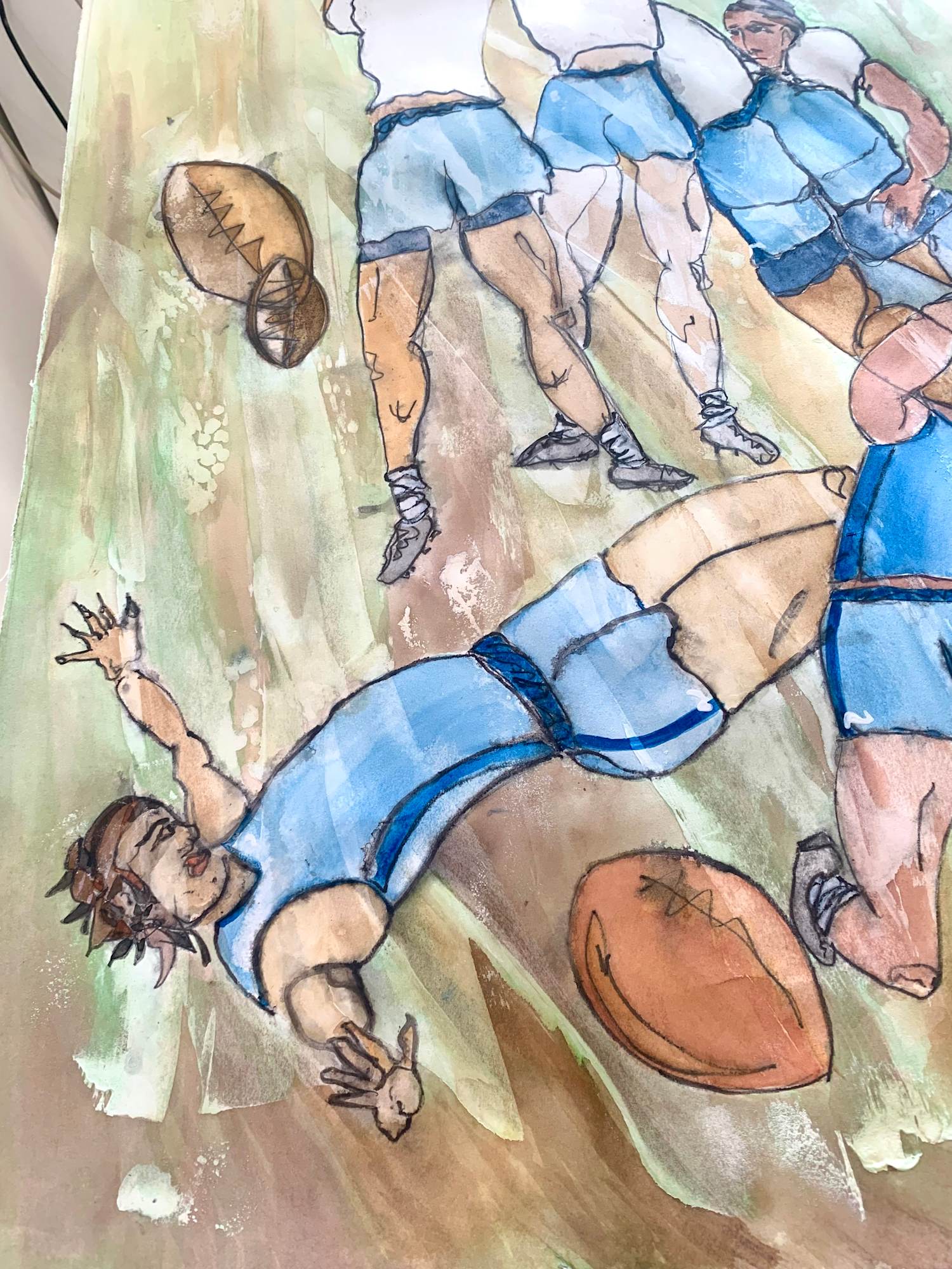 From several gestural quick 30 seconds drawings done in situ while the guys were playing. My love of sport and movement is well conveyed and their “in the moment” expressions are transparent in their facial expressions.