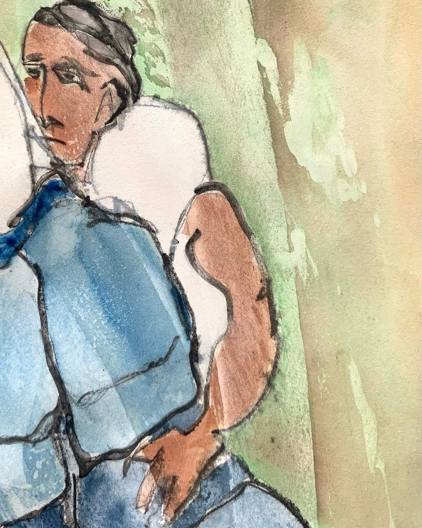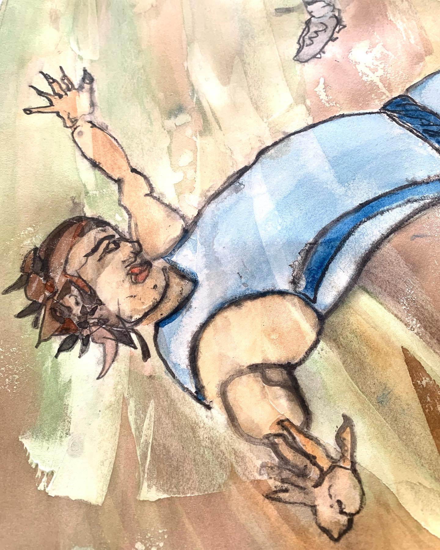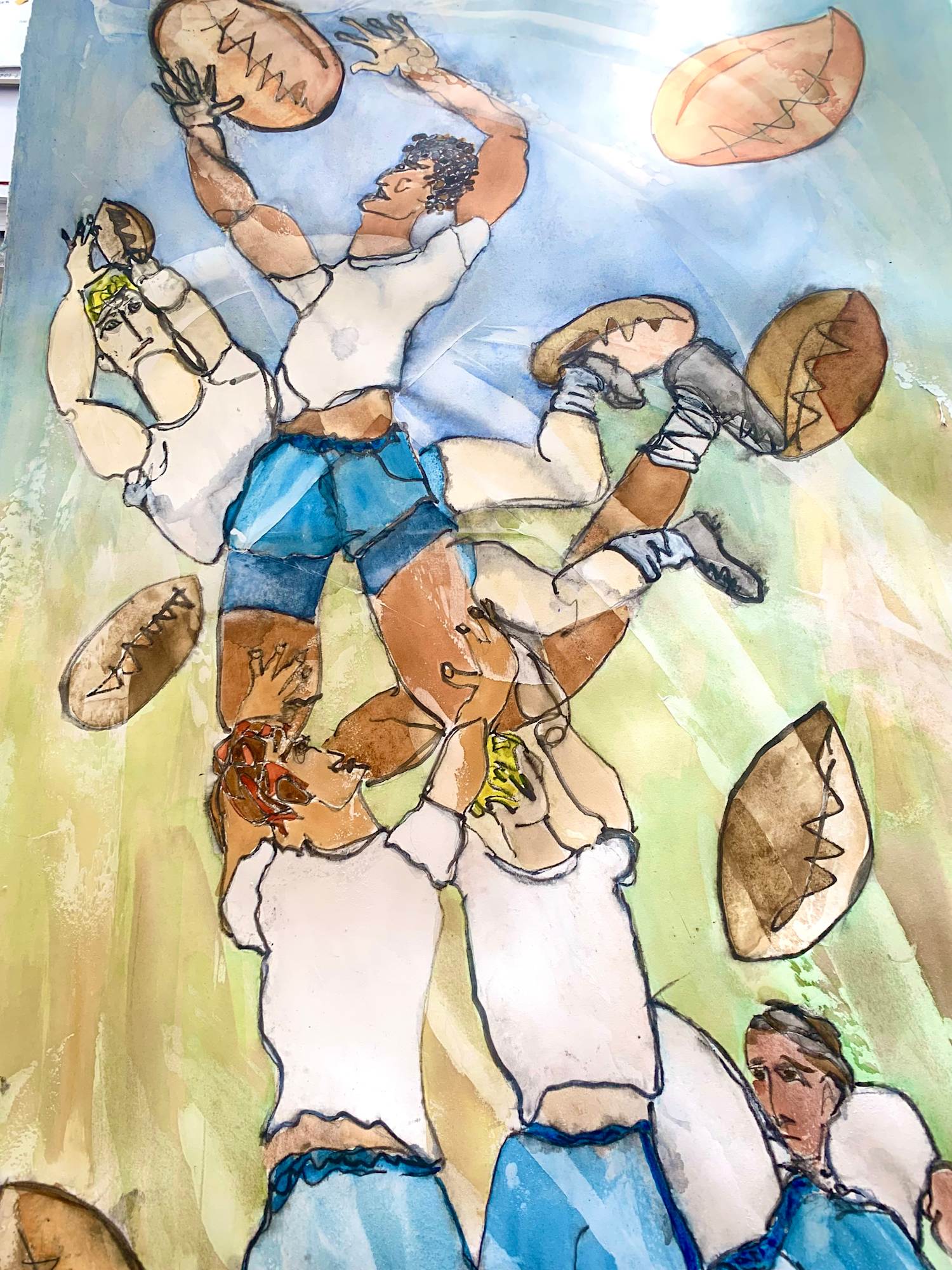 From several gestural quick 30 seconds drawings done in situ while the guys were playing. My love of sport and movement is well conveyed and their “in the moment” expressions are transparent in their facial expressions.