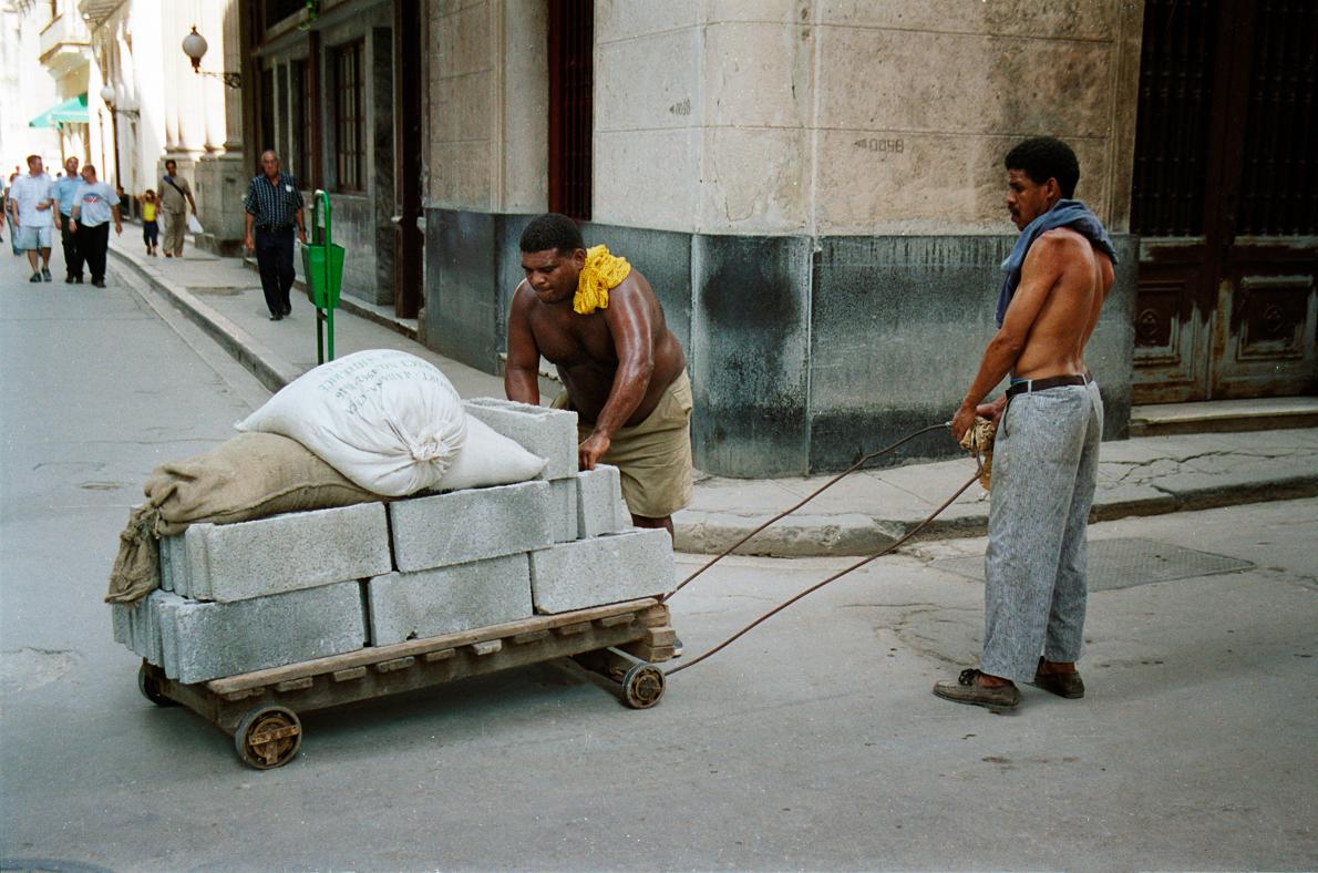 Tamagni travelled to Cuba for the first time in 2003, where he shot his very first rolls of film. Unerthed and digitalised by the Daniele Tamagni Foundation in 2022, these photographs mark the beginning of Daniele's love of photography, showing the seeds of what would become his distinctive approach to photographing communities around the world. La Havana, Cuba, 2004. Two men pull a cart loaded with bricks down a street.