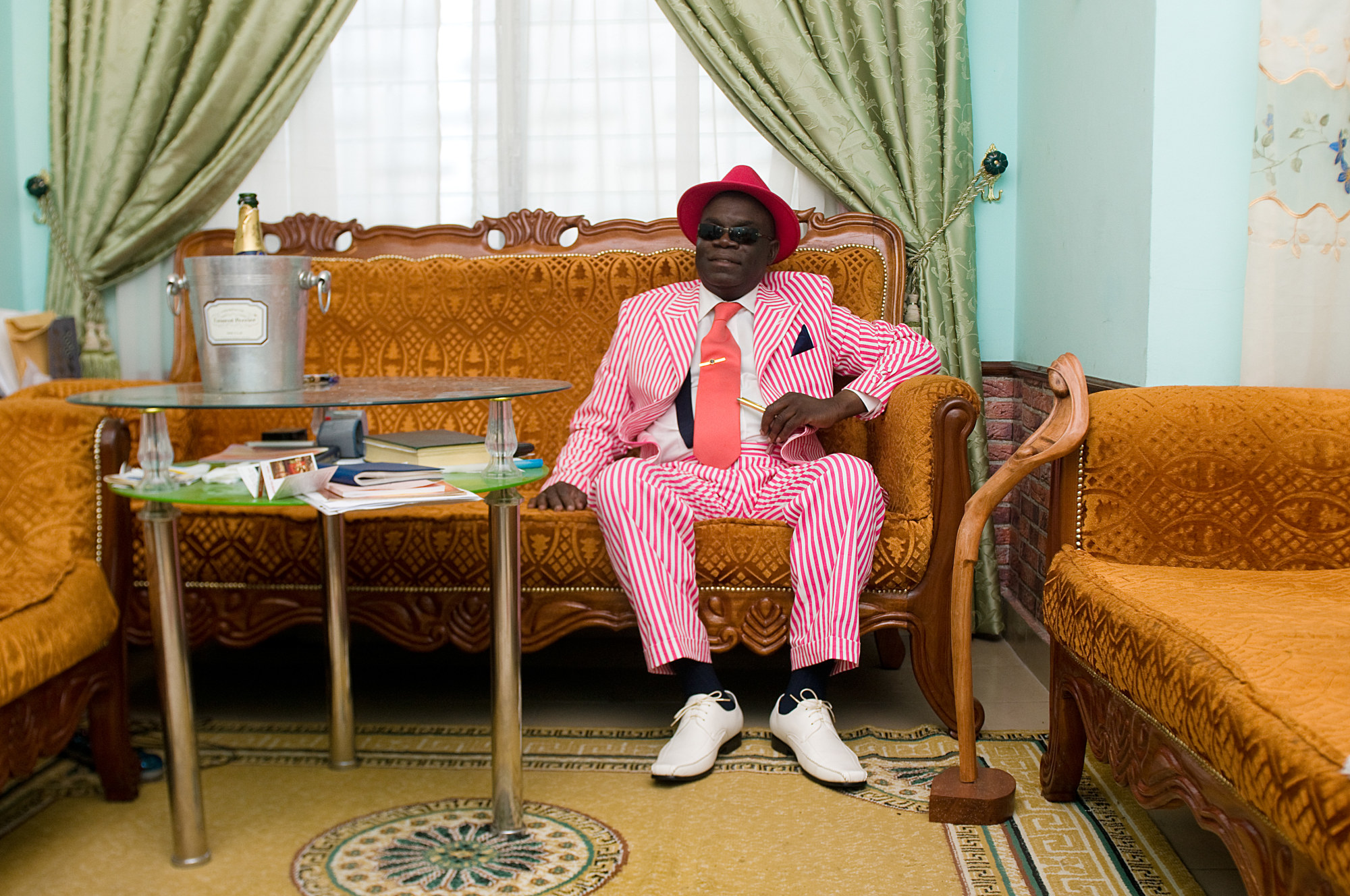 Anselme Badiamo, known by all as the 'abbé Chalereux', wearing a red and pink striped suit and a red hat, sitting on his couch. Brazzaville, Congo (2008)