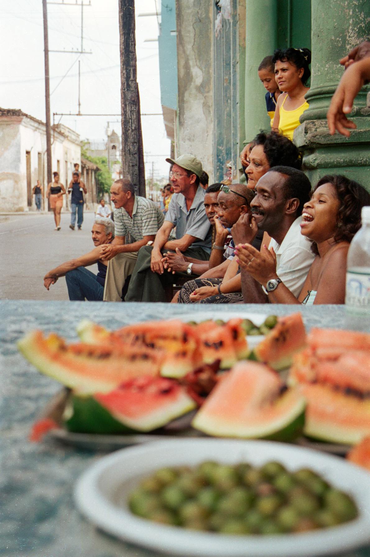 Tamagni travelled to Cuba for the first time in 2003, where he shot his very first rolls of film. Unearthed and digitalised by the Daniele Tamagni Foundation in 2022, these photographs mark the beginning of Daniele's love of photography, showing the seeds of what would become his distinctive approach to photographing communities around the world. La Havana, Cuba, 2004. A small crowd of people sitting in the street watch and cheer, watermelon and other foods in front of them.