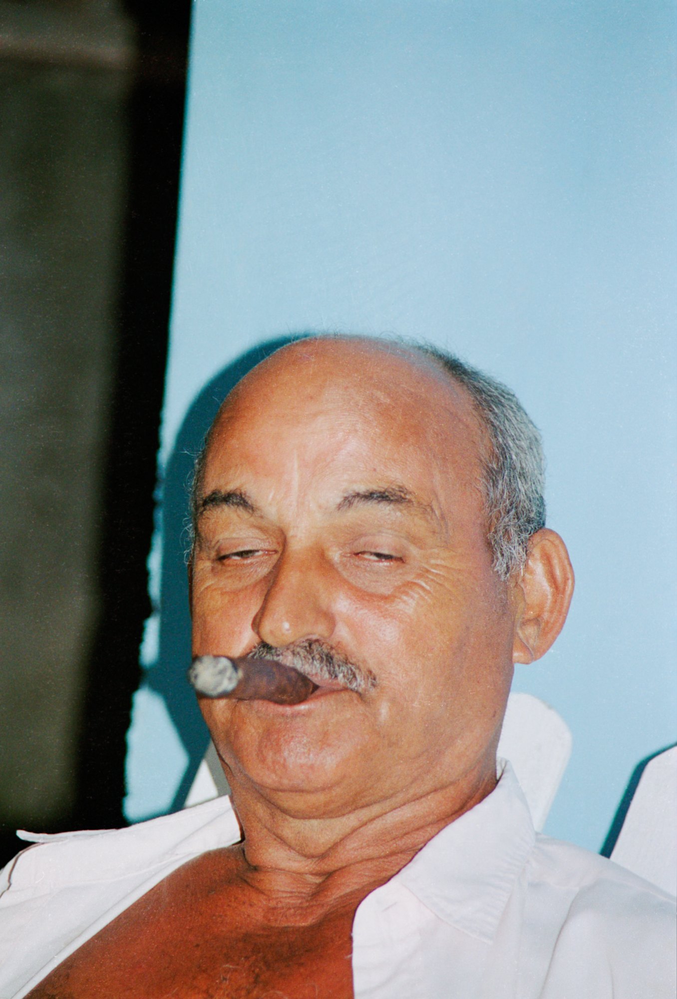 Tamagni travelled to Cuba for the first time in 2003, where he shot his very first rolls of film. Unearthed and digitalised by the Daniele Tamagni Foundation in 2022, these photographs mark the beginning of Daniele's love of photography, showing the seeds of what would become his distinctive approach to photographing communities around the world. La Havana, Cuba, 2004. A man smokes a cigar. His white shirt is open and his eyes halfway closed. The portait is taken with flash.