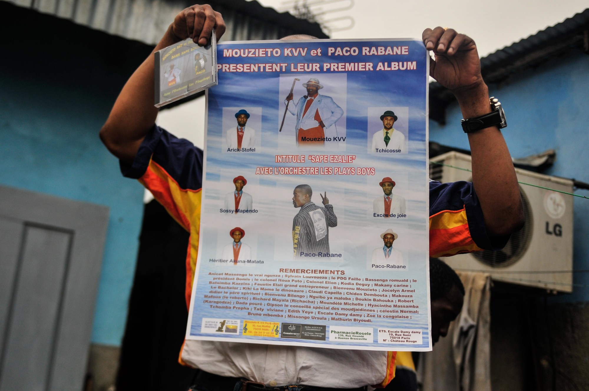 Unpublished photograph of a man holding a poster advertising the launch of the first musica album by Kvv Mouzieto and Paco Rabane, "Sape Ezalie", with the Orchestra Les Plays Boys. Brazzaville, Congo (2008)