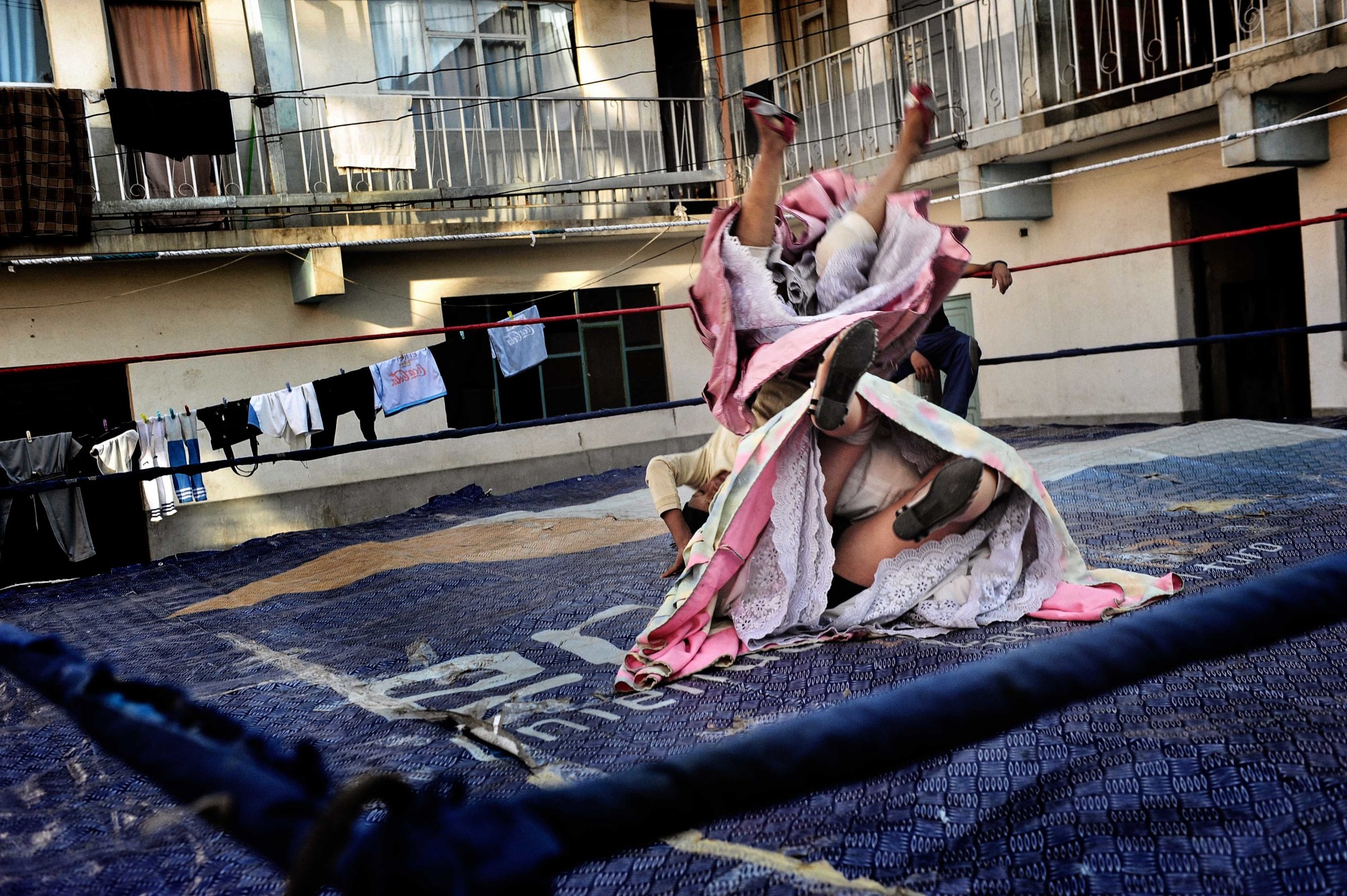 Julia and Yolanda rehearse their acrobatics together during training, allowing a glimpse of the embellishments of their petticoats.