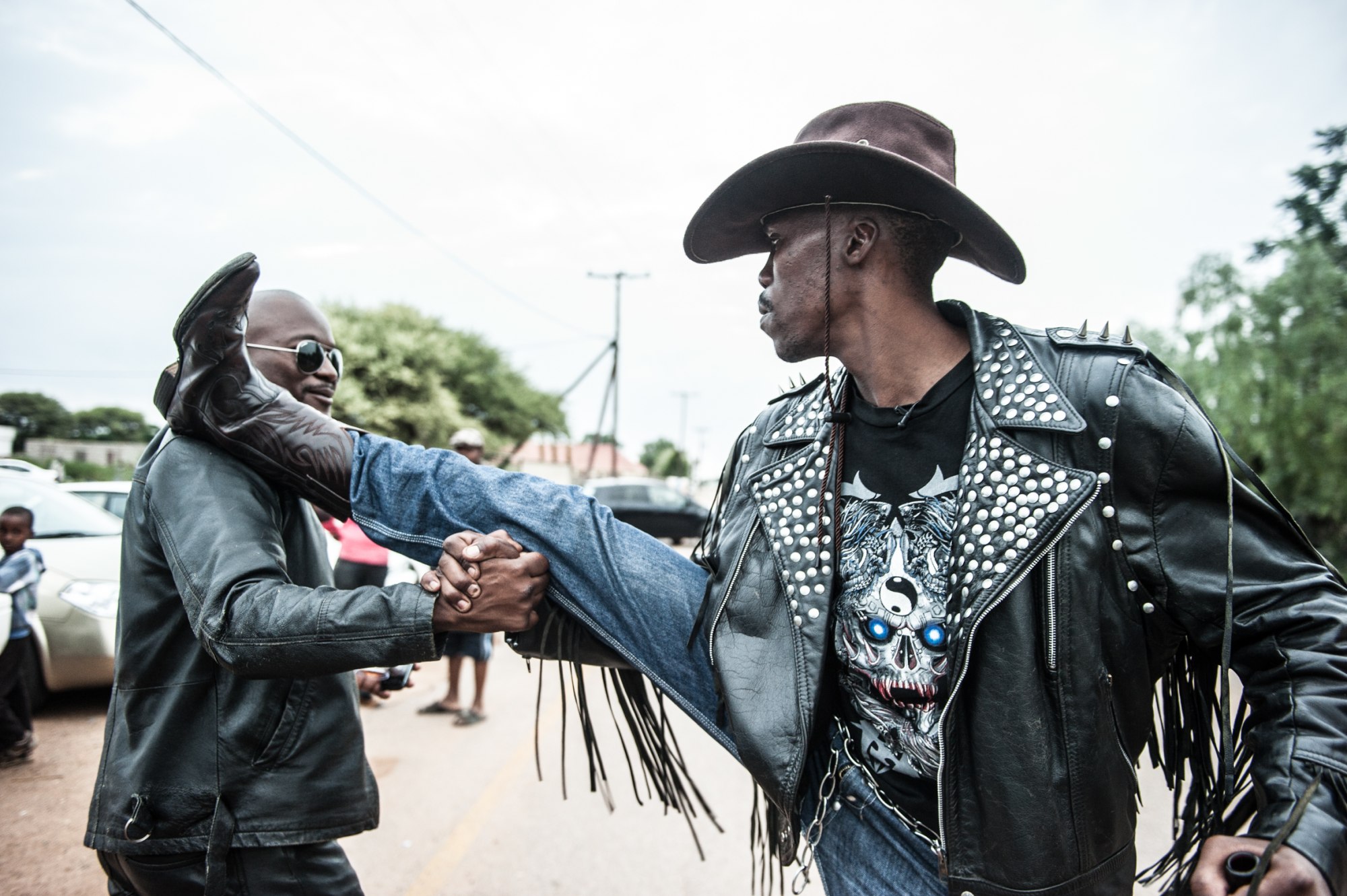 Two metal fans saluting each other on the streets outside the Bull & Bush for the Rockcember! concerts to begin.