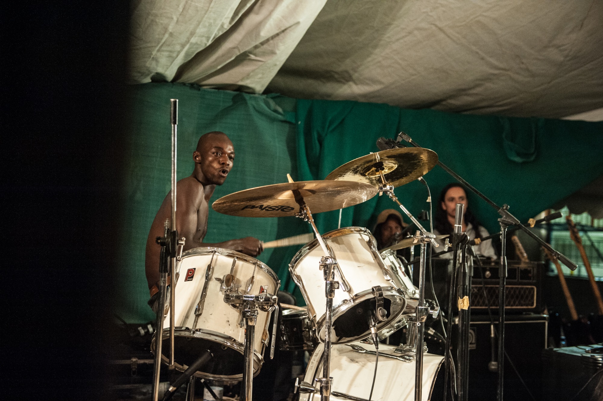 A drummer playing at the Rockcember! charity concerts held by the Bull & Bush pub.