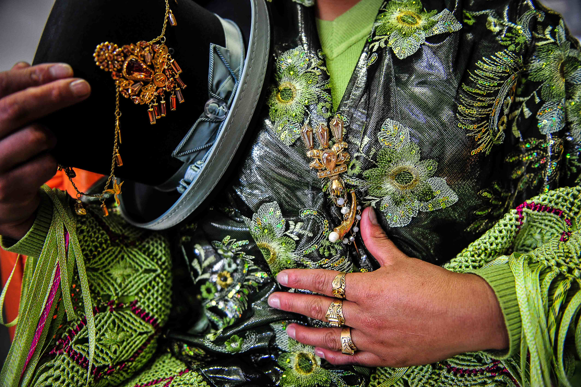 Details of the embroidery of the mantle and hat of a traditionally dressed Cholita.