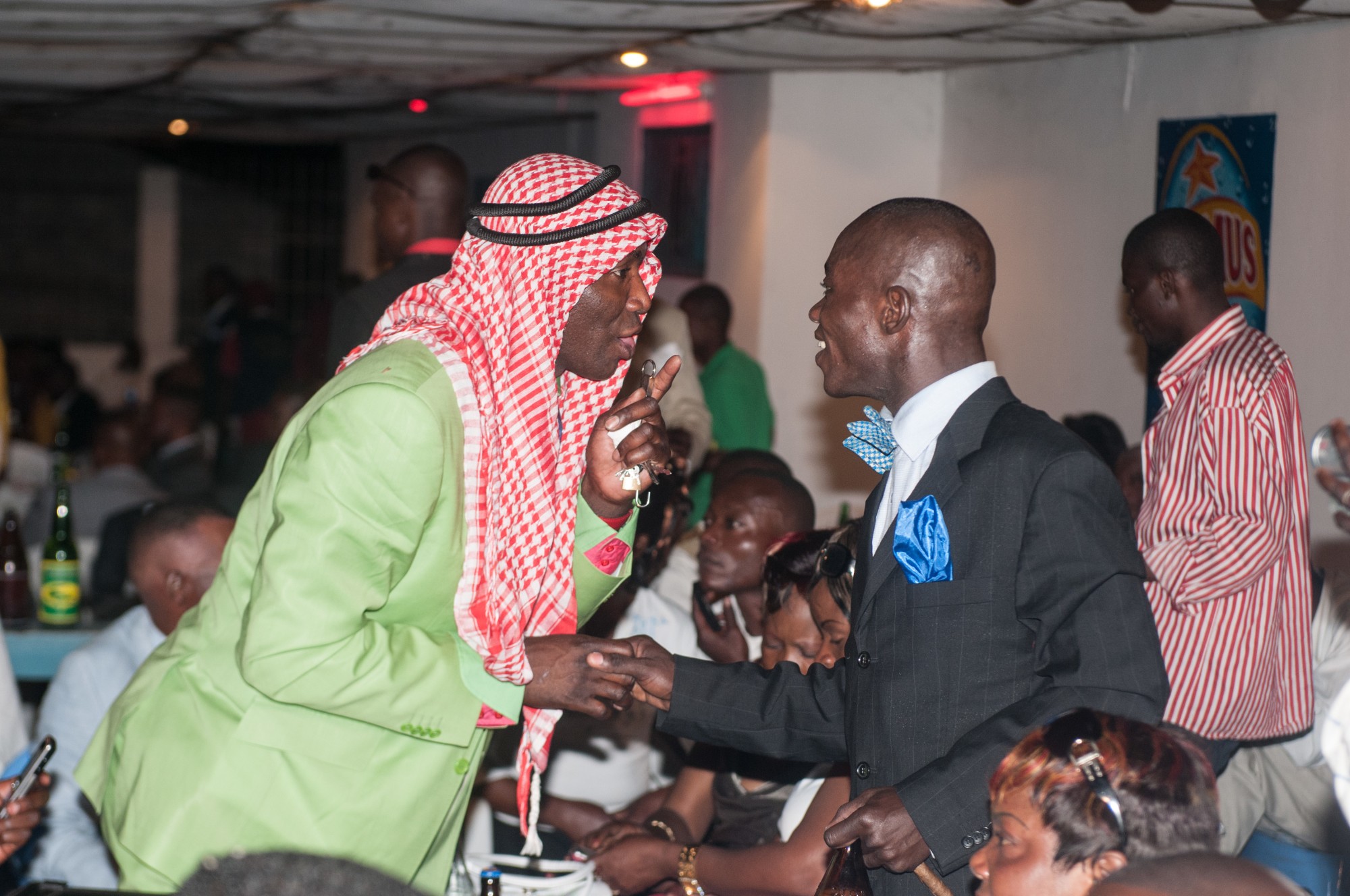 Man with a red kefia on his head and bright green jacket shaking hands and talking with a man in dark blue pinstriped suit in a nightclub. Brazzaville, Congo (2008)