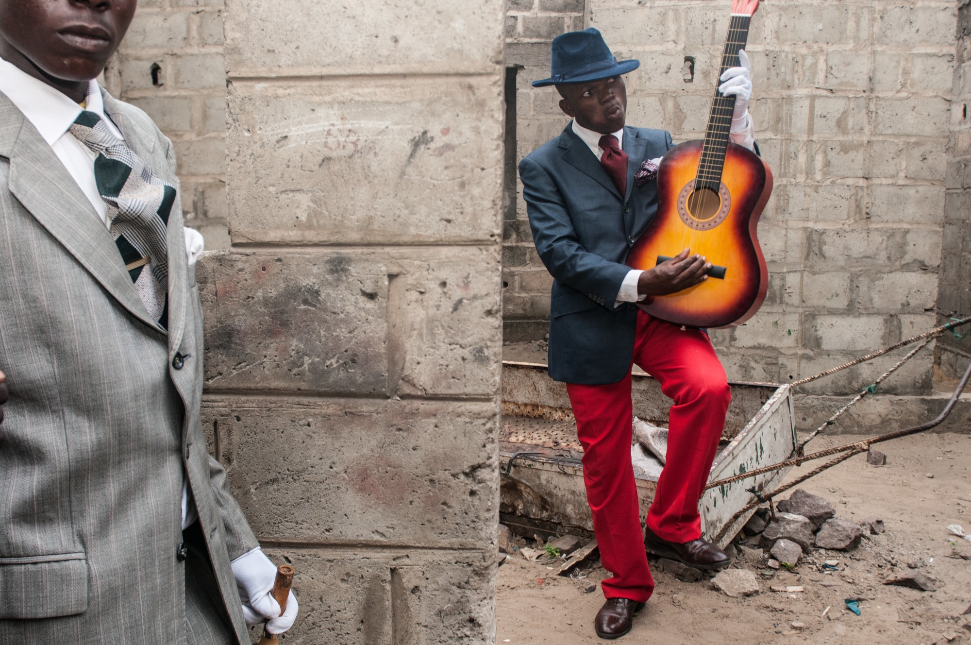 Two young Sapeurs, one in a gray suit and the other posing with his guitar. Brazzaville, Congo (2008)