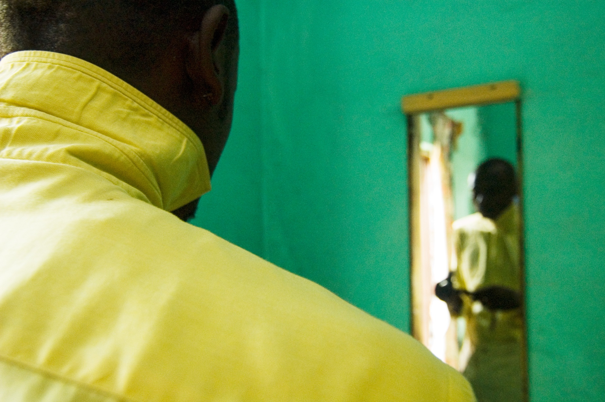 Photograph of Lalhande taken from behind, wearing a yellow shirt. Out of focus, in the background, his reflection in the mirror hanging on a green wall. Brazzaville, Congo (2007)
